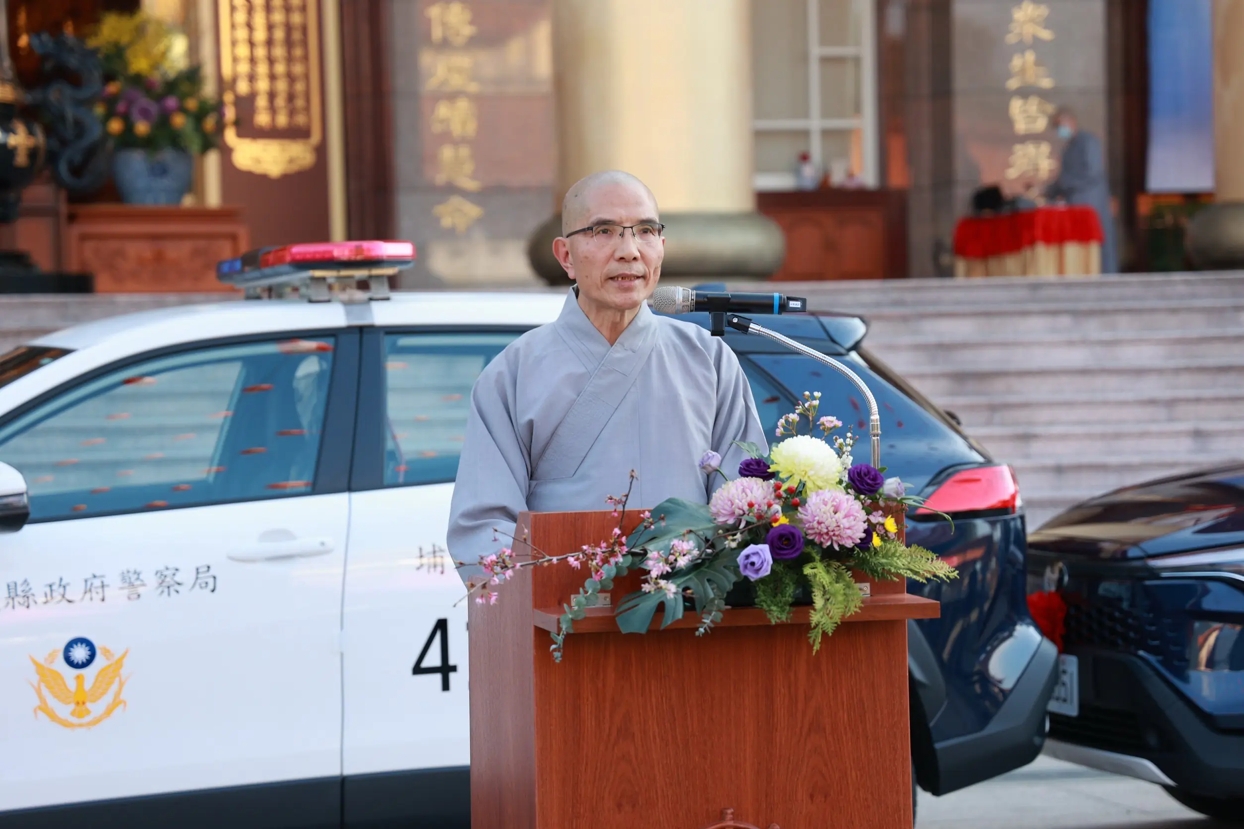 靈巖山寺首座和尚自賀法師說,南投是宗教、觀光聖地,卻面臨警力短缺與人口老化挑戰。寺方先前曾贈一輛警車,因使用年限屆滿而不足。這次提供三輛新車,希望補足警政單位戰力缺口,讓警察同仁更有效維護治安、安定人心,促進社會和諧、國家富強。