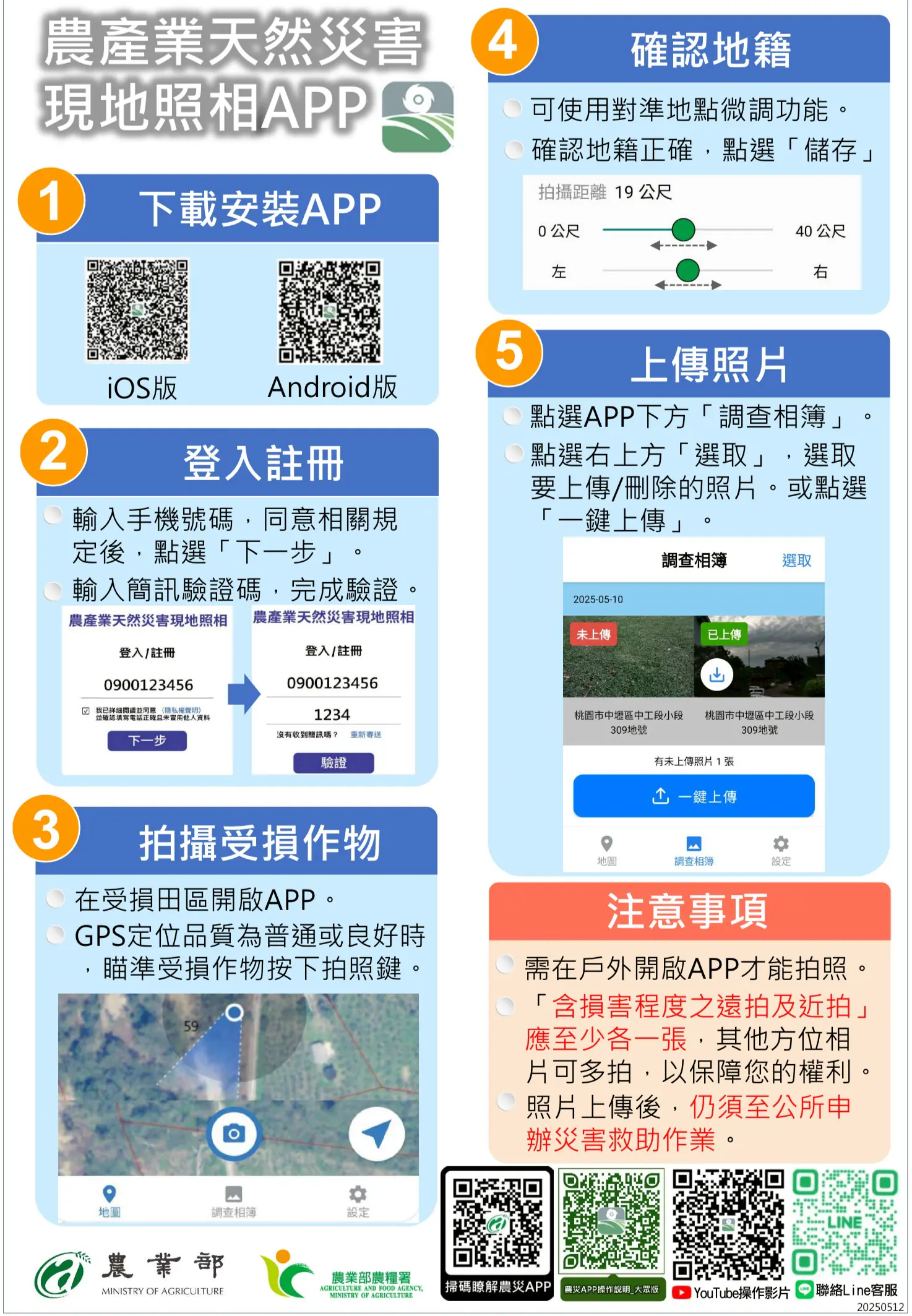 農業局指出,目前已通報各區公所密切注意並宣導相關防範措施,後續倘有災情顯現,亦請農友主動向當地公所通報,並請依農業天然災害查報作業規定辦理。另外,公所對於災後需即時採收及復耕之受災田區作物,應動員人力進行勘查及拍照取證工作,並加強宣導農友可自行拍攝當次災害損失照片,內容應包含拍攝日期、災損情形、相鄰田區、可識別田區位置之背景及衛星定位資訊,並自行標示田區坐落地段及地號等。農業部已開發具有定位功能的「農產業天然災害現地照相APP」,讓農民拍攝當次災害之災損照片作為佐證文件,協助基層公所保存作物受損證據,可多加利用。後續如經公告辦理救助,應於公告受理申請救助期間內,併同申請文件送基層公所備查,作為災損認定之佐證參考資料,兼顧受災農民即時復耕與申請農業天然災害救助之權益。