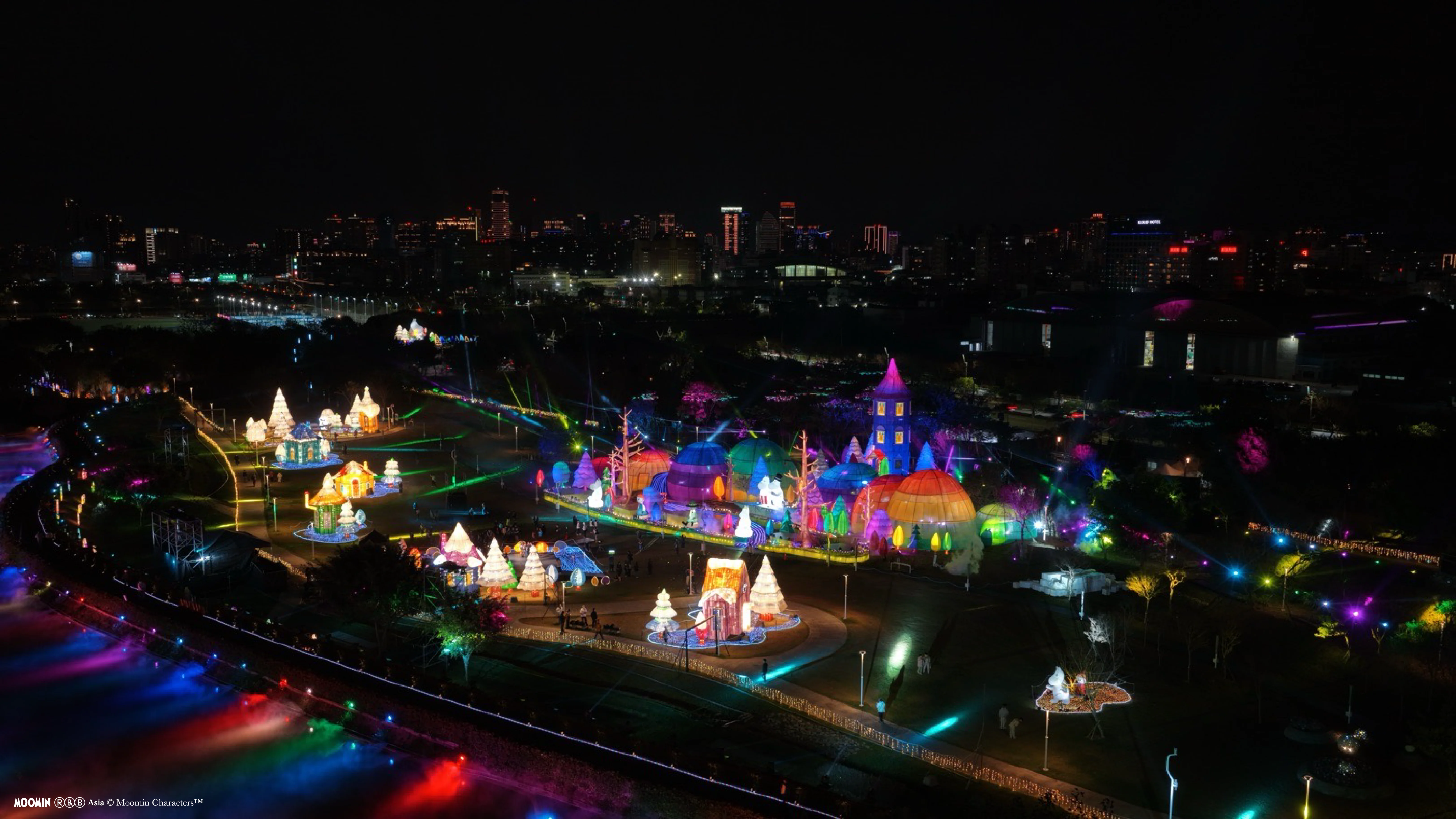 鄭副市長表示,中台灣燈會自2月15日(小年夜)點燈至3月3日(元宵節)閉幕,展期16天期間僅除夕休展。適逢農曆生肖馬年即將到來,為讓傳統藝文節慶邁向國際,中台灣燈會今年特別與Rights and Brands Asia(RBA)旗下80週年的全球人氣IP「姆明一族(The Moomins)」跨界合作,巧妙取用”Moving on”的諧音與姆明(Moomin)的角色形象,以「幸福蜜馬 台中MOOMIN ON!」為主題,打照以姆明一族為主角的展區。主燈區「極光下的姆明谷」以有著紅瓦屋頂、藍莓色外牆的15公尺高「姆明家」為視覺焦點,述說親友間彼此相愛、互相接納的暖心敘事,技術上更突破以往IP氣偶只能靜態觀賞的框架,結合動態機械科技,讓氣偶搭乘環形軌道列車穿梭於樹林山谷間,搭配如蝴蝶飛舞的高空綢吊專業舞者,輔以彩雷、煙霧呈現漫天極光的效果,加上特效泡泡帶來的驚喜,全方位營造出這場洋溢著希望與幸福的夢幻極光秀。