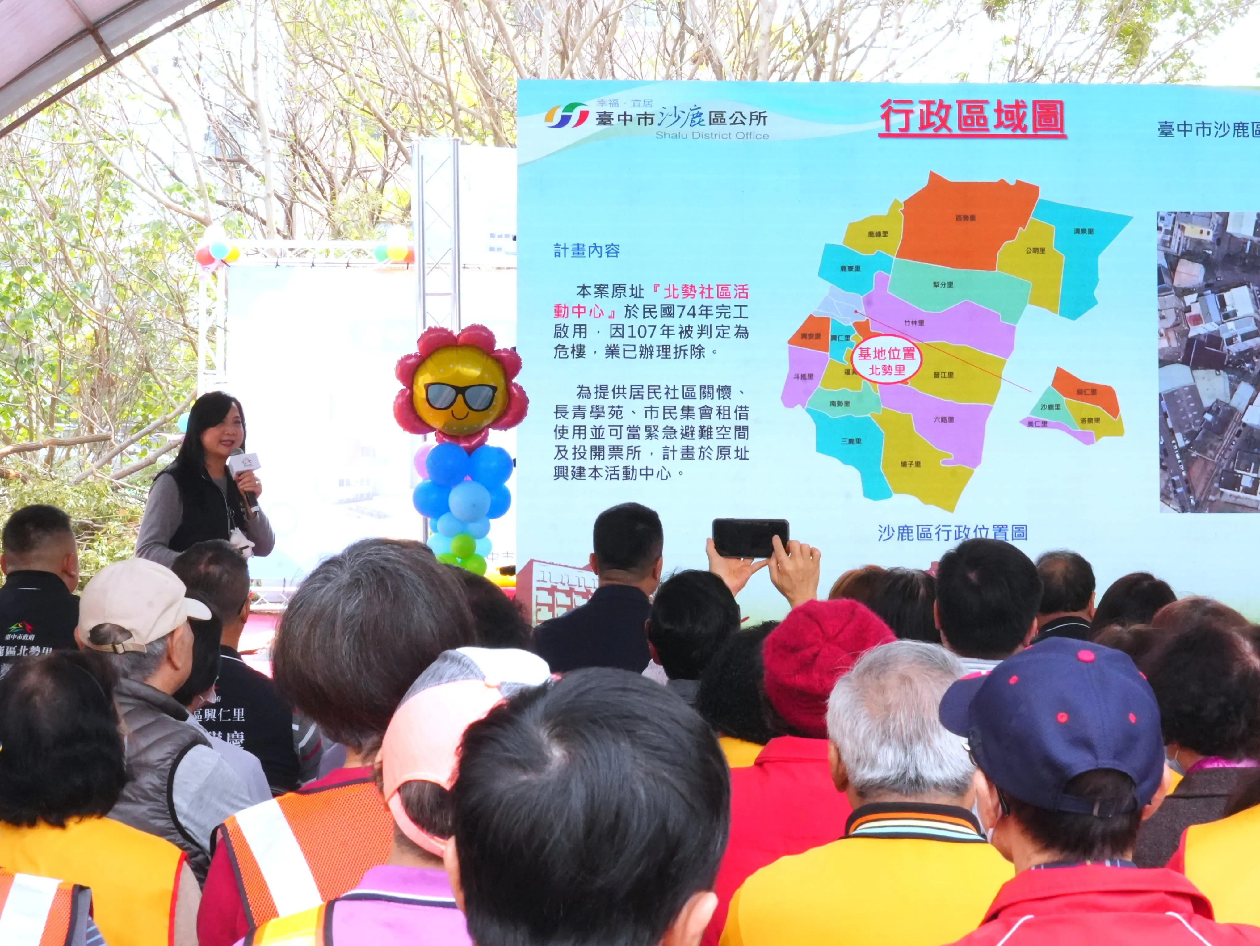 吳局長指出,北勢里市民活動中心位於北勢國中附近,鄰近靜宜大學商圈及沙鹿區行政區,交通便利、緊鄰住宅區,屬沙鹿區精華地段,規劃興建地上2層樓鋼筋混凝土建築,1樓將作為關懷據點及長青學苑使用,2樓則規劃為市民活動空間,總樓地板面積約115坪,並保留未來因應地方使用需求增建的彈性,若工程順利,預計今年底完工,屆時將提供居民集會、活動及休閒等多功能友善活動場域。