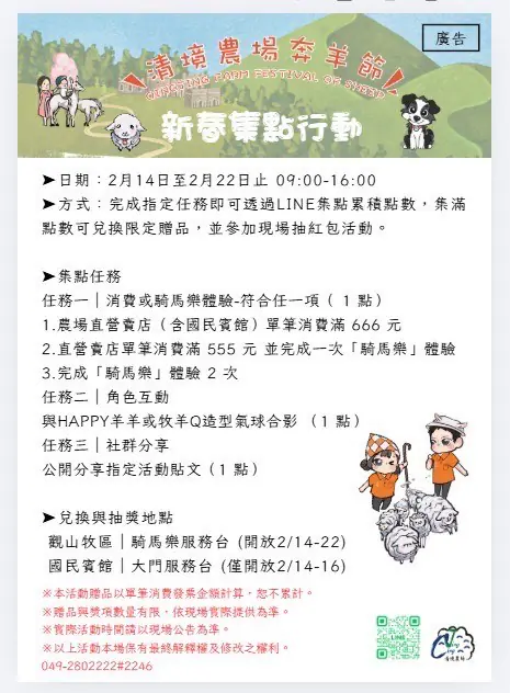 此外,2月14日至2月22日推出「集點同樂・牧羊Q新春行動」,旅客可透過消費、體驗與互動任務累積點數,兌換限定好禮並參與抽紅包活動。清境農場提醒,奔羊遊行將行經高山公路路段,建議遊客配合現場動線與工作人員引導,並留意交通與安全事項,共同維護活動順利進行。
