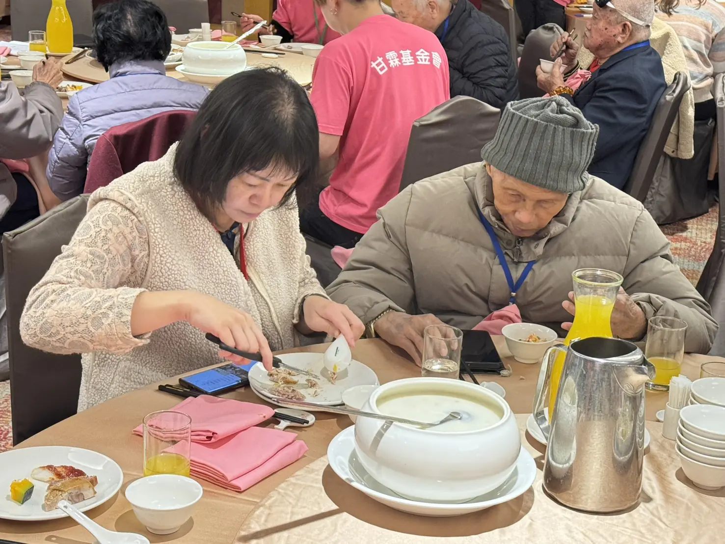 農曆春節將至,台中市12家善心企業再度攜手送暖,合力捐贈逾124萬元年菜經費,今(7)日市府社會局感謝企業提前邀請獨居長輩及身心障礙者圍爐共餐,讓長輩們在歡笑與陪伴中感受年節溫度。現場最高齡101歲的馬爺爺與96歲的楊奶奶攜手出席,溫馨畫面感動全場。