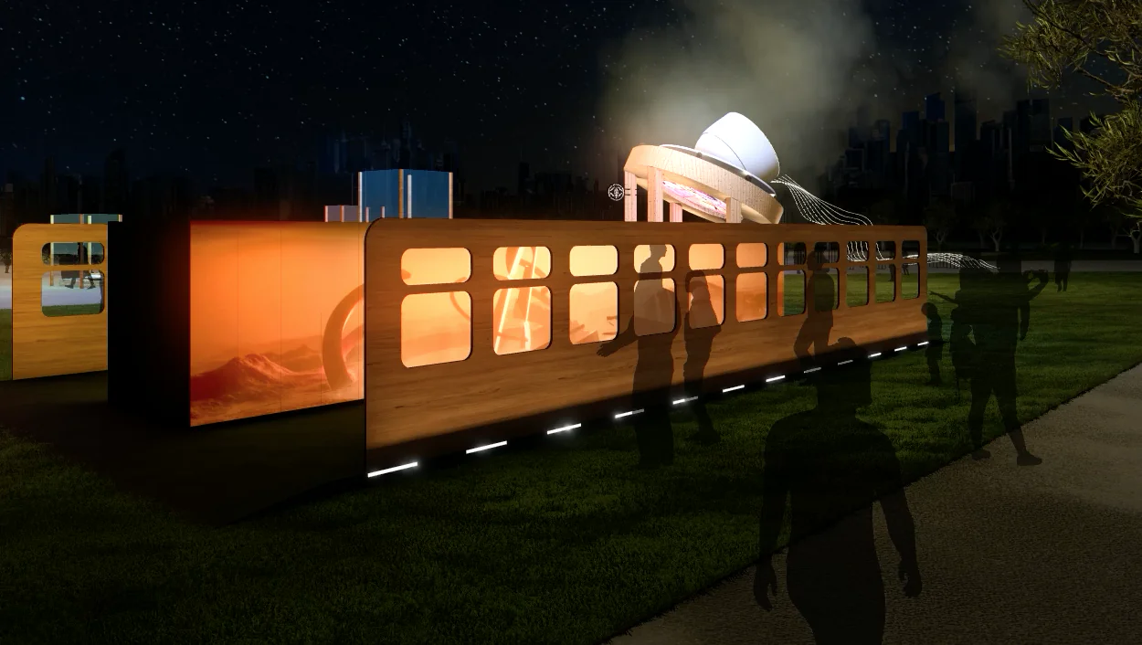 以嘉義火車車廂為靈感,這個燈座重現了啟程與歸來的動人場景,並利用雙面LED光牆,創造一條「穿越時空」的感官走廊。觀者如同置身時光隧道,感受嘉義與過去、未來之間的緊密聯繫。