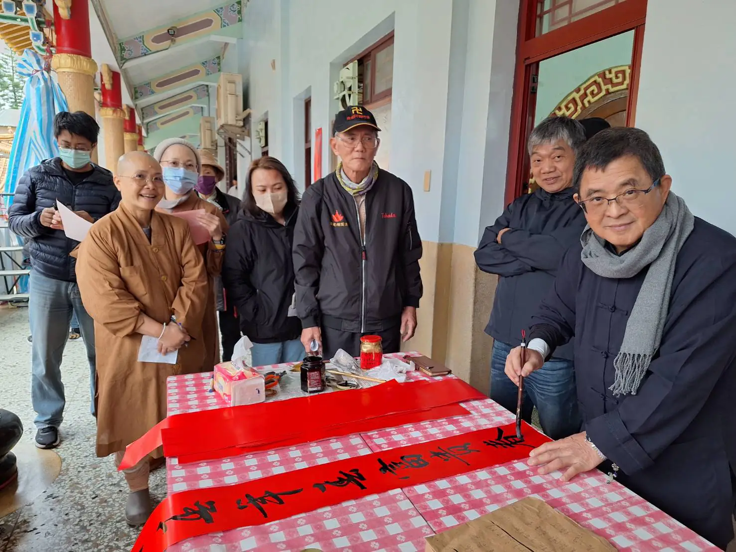 圓光禪寺的春聯揮毫活動,自上午9時開始,8時30分許即有多名僧俗排隊等候領取春聯,現場喜氣洋洋。圓光禪寺方丈和尚性尚法師撥冗到場,為吳大仁與書法老師們加油打氣,感謝他們回饋社會,利益眾生,書寫俊秀充滿年味的春聯,帶給大眾快樂與希望。