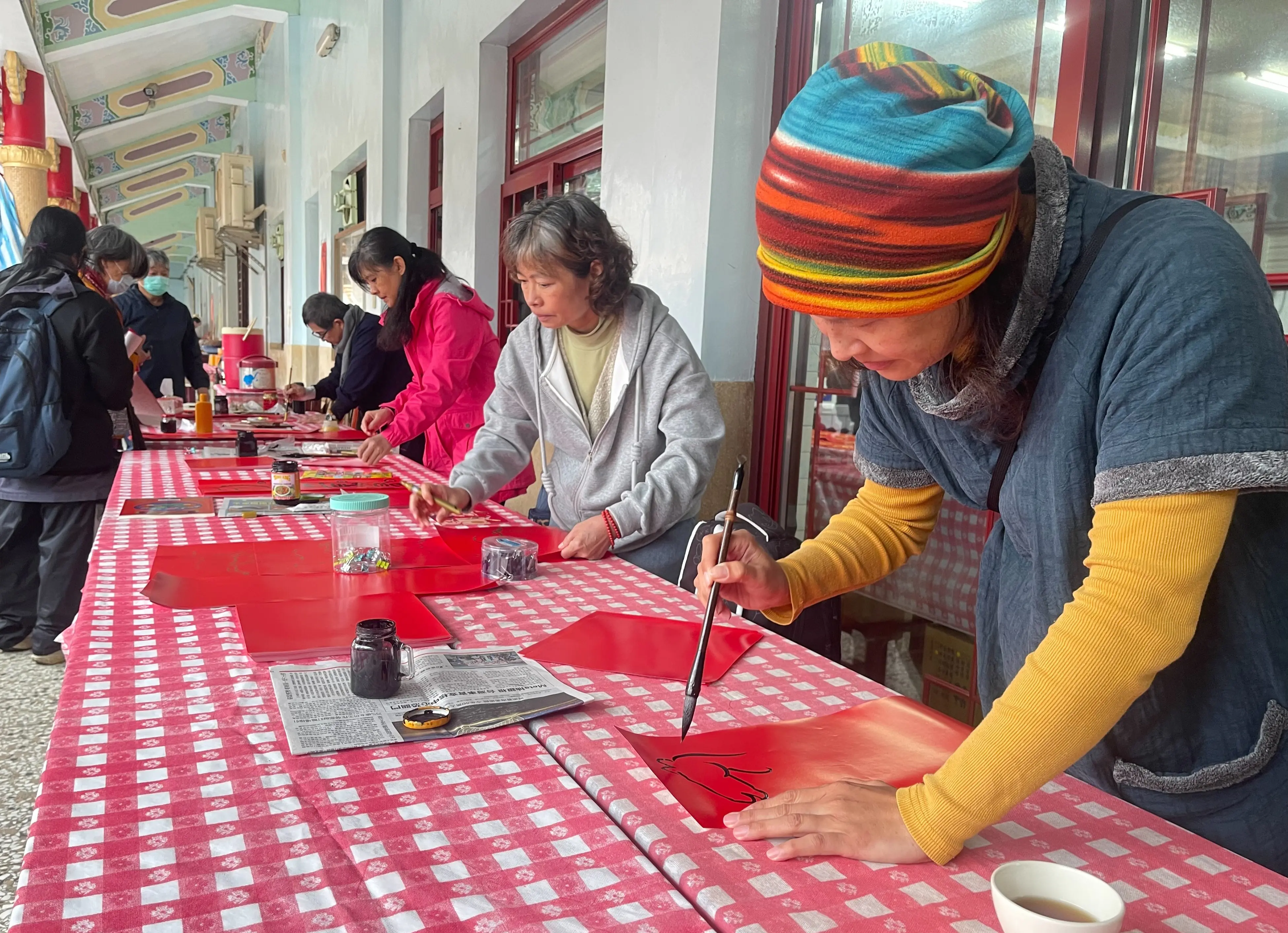 有一位書法老師還在七言對聯上畫了7尊莊嚴的佛像,並寫上六字大明咒,當場被眼明手快的一位外籍女移工搶走,還比手畫腳拜託書法老師再給下聯畫7尊佛像。書法老師二話不說滿了她的願。圓光禪寺的春聯揮毫活動,至中午12時15分圓滿。