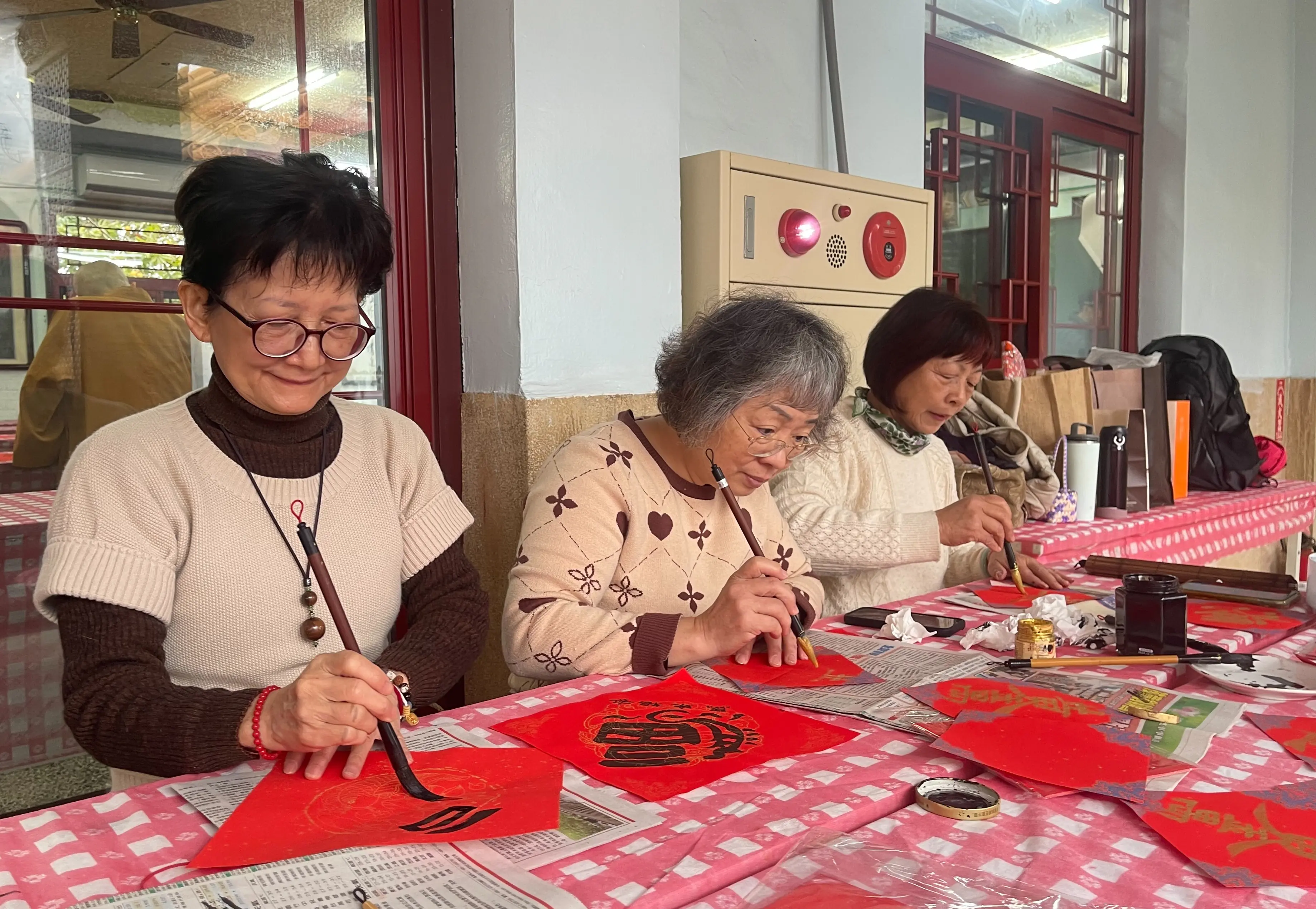 值得一提的是,吳大仁與書法老師寫的單字春聯真是妙筆生花,有的正方型單字春聯是用3、4個字疊在一起,例如:福祿壽、招財進寶等,都令人賞心悅目。吳大仁指導的圓光禪寺禪藝書法班學生藍老師、素秋、碧連居士等3人,也在現場揮毫並畫牡丹妝點陪襯,共襄盛舉。