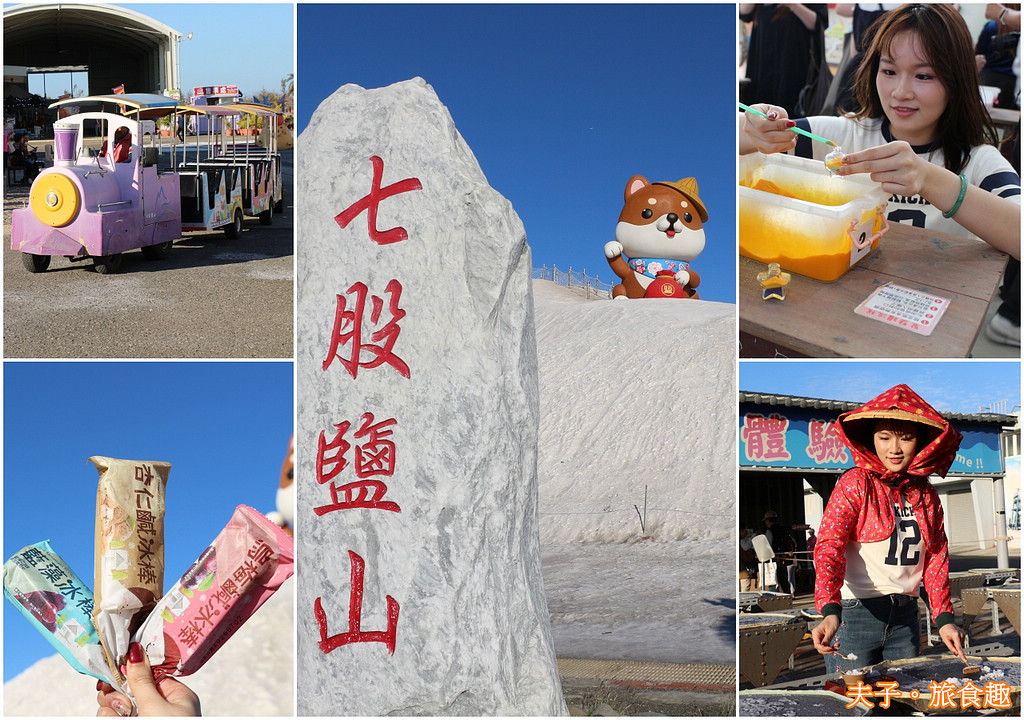 七股鹽山春節期間大年初一~初五 (2/17~2/21) 正常營業,並有街頭藝人互動演出。期間消費滿額送「柴犬刮刮卡乙張」,有機會刮中可愛柴犬木夾。(圖) 七股鹽山,大眾交通運輸: 1. 台南市火車站沒有公車直達七股鹽山,在台南東站 (火車站附近) 搭乘大台南公車,約15~20分鐘一班,至佳里區分站再轉車往青鯤鯓 (經七股台區),每日平均約70分鐘一班,於七股鹽山站下車 (確實時間班表請至公車網路或大台南公車服務電話 06-263-6637 查詢)。 2. 從高鐵台南站搭接駁車 H32 路至台南大飯店 (火車站前) 下車,再轉搭大台南公車往佳里的客運班車 (佳里站下車),再轉往七股台區之班車,車程約40分鐘。