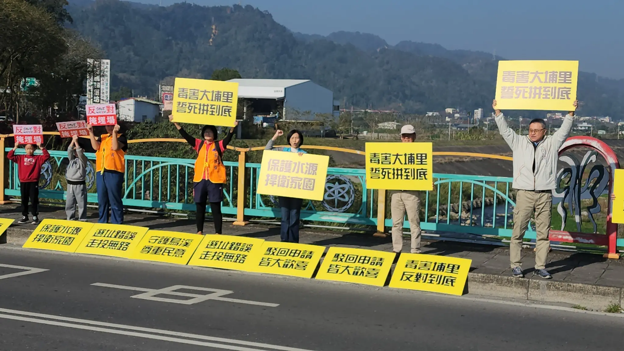 「反對埔里鎮設置廢棄物掩埋場大聯盟」今天上午9時前往埔里愛蘭橋進行快閃行動,50多位民眾分站愛蘭橋兩側,向過往人車高舉反對設置廢棄物掩埋場的牌子並拉起白布條,高呼口號表達堅決反對埔里設置廢棄物掩埋場的立場,鎮長廖志城、議員陳宜君及多位里長、社區理事長一同到場力挺,不少車上乘客也開窗比讚支持這項行動,還有熱心民眾特別準備貼上回郵的連署書,方便外地民眾連署後順利寄回。