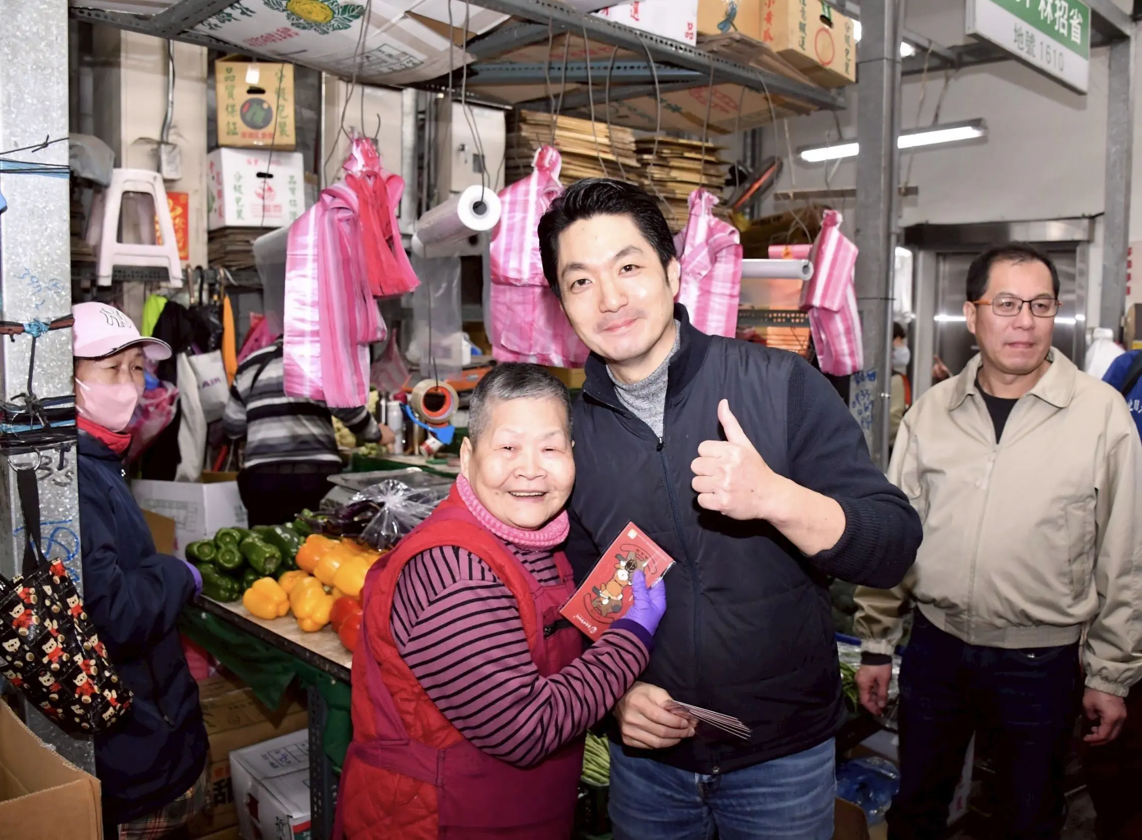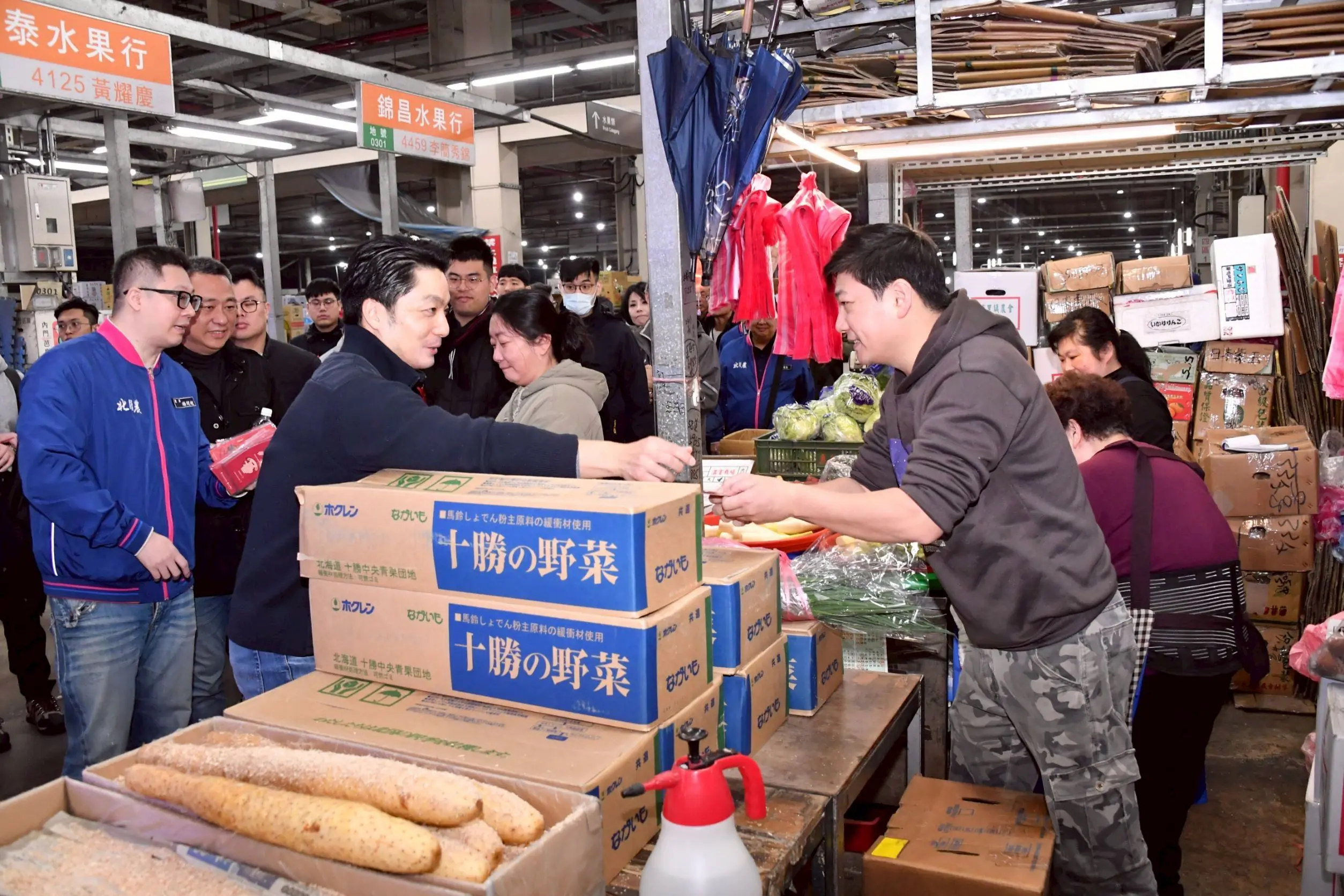 蔣萬安以流利台語向攤商逐一致意、拜早年,感謝每位頭家、頭家娘清晨趕早打拚,全年無休為市民把關最新鮮的農漁蔬果,撐起臺北的民生供應。