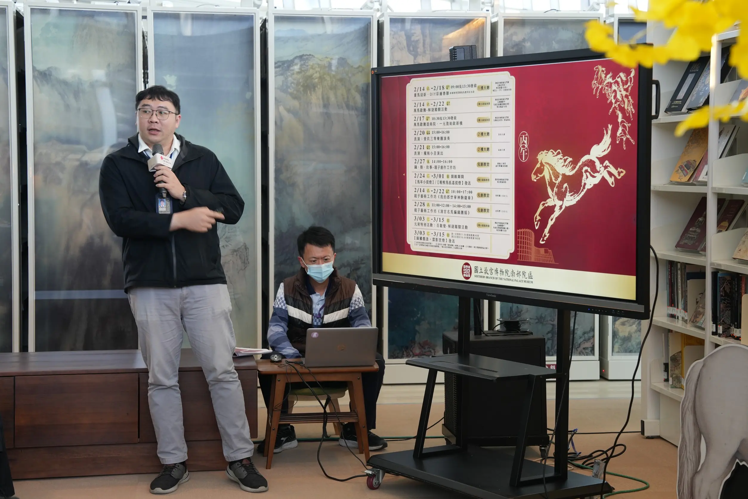 故宮南院一樓大廳「光彩駿躍:馬年數位互動展」為名的數位作品以投影動畫與立體光雕技術使郎世寧〈百駿圖〉中的駿馬流動光影,呈現豐富色與姿態。此外,新春期間特別規劃一系列趣味活動,包含解謎闖關、親子藝術工作坊、DIY彩繪春聯、音樂會與小丑表演等親子節目,提供觀眾春節期間的多元體驗2月14日至18日憑門票可領取限量的「畫馬迎新.DIY彩繪春聯」材料包,完成後可帶回獨特的紅包袋,2月24日至3月1日憑門票還有機會兌換限量「馬年小提燈-小雪」或「喔熊馬抵嘉」小提燈。