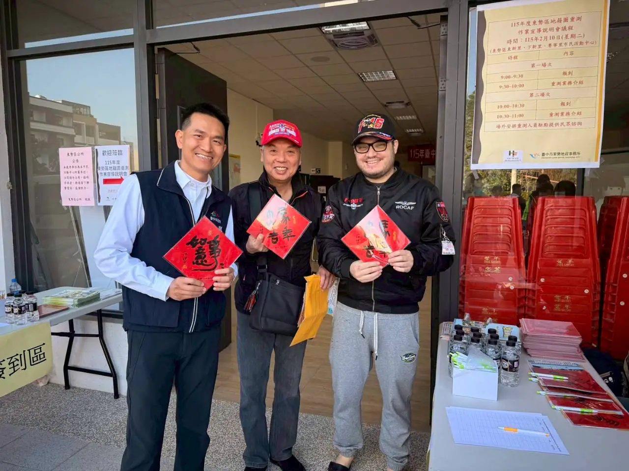 東勢地政所主任陳應欽也提到,重測工作委外辦理,均有配戴識別證穿著背心,指界釘樁與換發所有權狀都是免費,如有遇詐騙或相關疑問均可電洽地政事務所查證。由於宣導會時程接近農曆春節,東勢地政所特別準備「事事如意」、「馬年大吉」春聯於會場發送,民眾在了解政策之餘,也感受濃厚的年節氛圍。