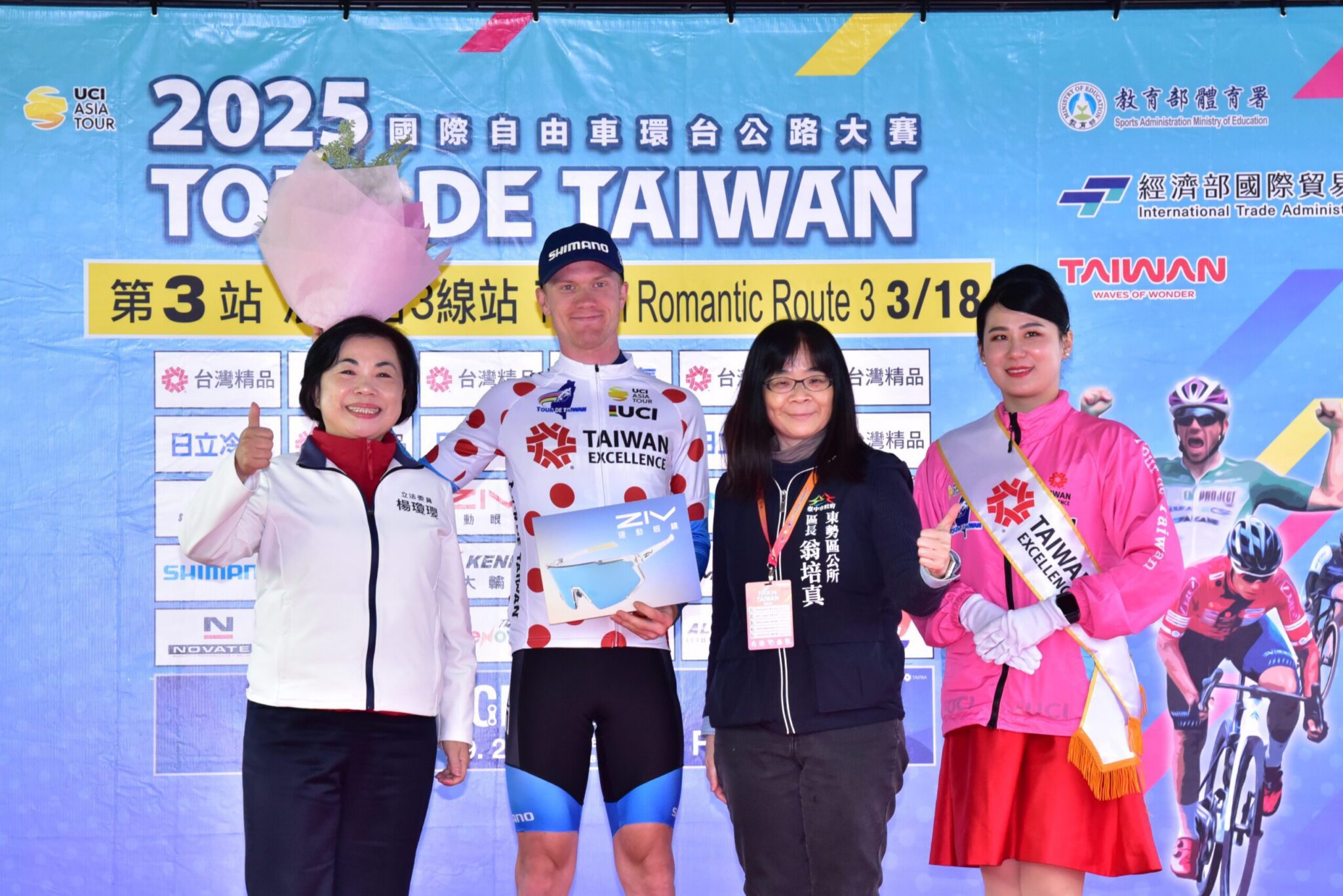 2025年「國際自由車環台公路大賽」於3月16日至3月20日盛大舉行,今(18)日賽事進入第3站「浪漫台三線站」,行經新竹縣、苗栗縣與台中市。台中市政府客委會主委江俊龍代表市長盧秀燕出席頒獎典禮,與來自全球的菁英車手共同見證這場競速盛會。此賽事透過多國語言於YouTube全球直播,向世界展現台三線純樸的客庄風貌與濃厚的人情味,成功行銷台中客庄魅力,讓台中風情閃耀國際舞台。