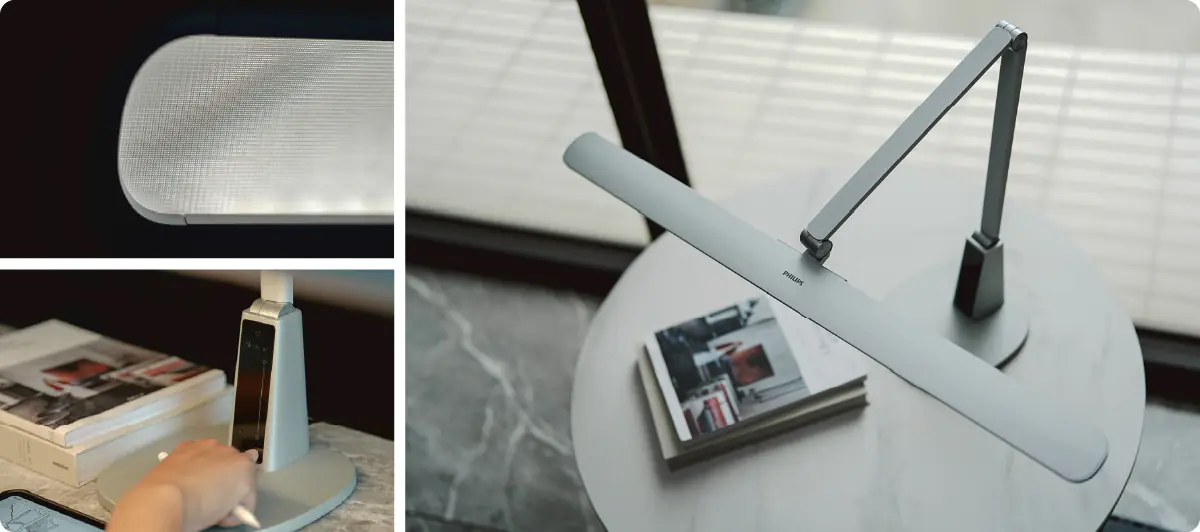 「飛利浦 A4L 智能 LED 護眼檯燈」擁有五大精準護眼設計,包括(1)護眼光.全桌覆蓋: 擁有80cm超長金屬燈頭、160cm全桌覆蓋,無論是中間帶書架的學習桌,或是左右分區的辦公桌平台,均可實現—『一盞燈,均勻明亮全桌。』(2)前置偏光技術:不直射抑制眩光閃爍,燈遠光近更護眼,將光線直送到您面前,坐姿也能舒展得更健康,前置偏光技術讓光線更柔順、不閃爍。久坐辦公、讀寫,也能自然放鬆肩頸與眼睛。(3)全台首獲SGS全光譜認證:超越 CNS AA級標準,A4L 採用 全光譜 LED 光源,類比太陽光譜,重現自然柔和的白光,讓眼睛在長時間閱讀、繪圖、書寫時,維持穩定且舒視的視覺感受。(4)智能調光: 環境感測最適亮度,無論是早晨的陽光、夜晚的昏黃燈,都不再干擾學習節奏,長時間工作時,最好的光是能「懂得配合你」的光。A4L 內建環境光感測器,能即時感應周遭亮度並智慧調節光線,無論白天日照強、夜晚燈光弱,都精準維持最舒視、最適合你的照明。(5)舒視光科技:防眩光、低頻閃、無藍光危害。「飛利浦 A4L 智能 LED 護眼檯燈」通過 RG0 無藍光檢測,精準守護,無論是夜讀、設計,或是孩子寫作業,飛利浦獨家舒視光科技,結合前置偏光導光板,讓光線從前方投射,集中照亮使用區域,同時減少反光與眩光。