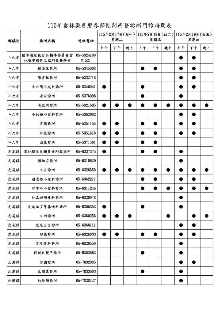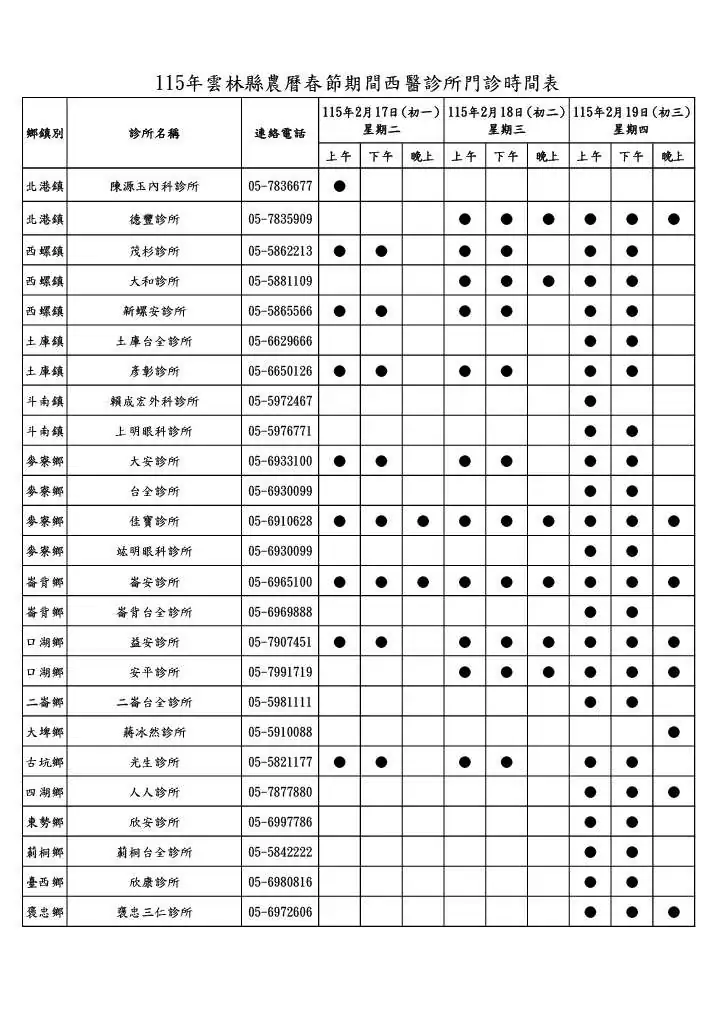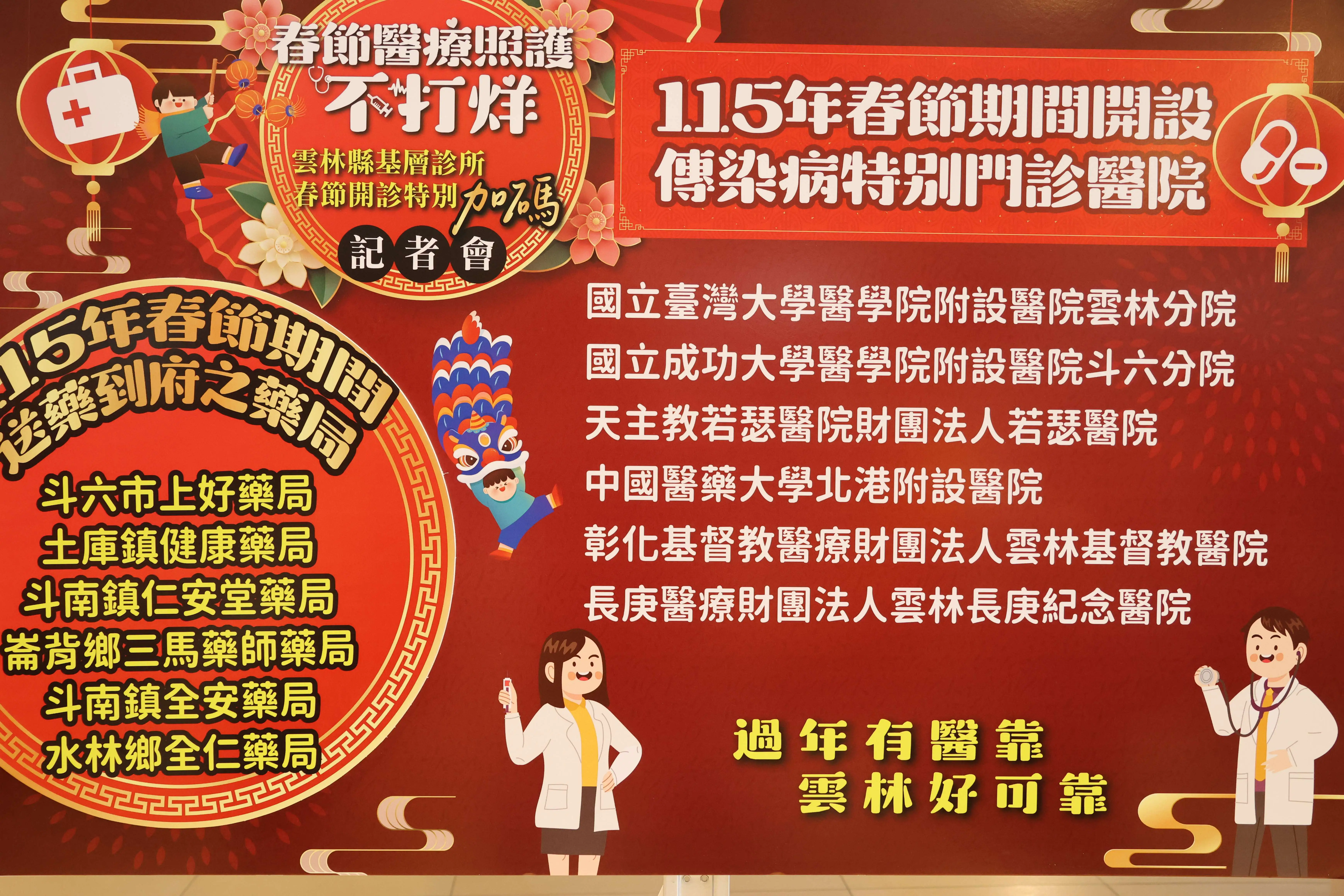 為因應農曆春節9天連續假期,預防春節期間急診壅塞及醫療量能吃緊,雲林縣政府提前整備春節整體醫療應變機制,全面盤點並整合縣內急重症與基層醫療資源,推出「春節不打烊」基層門診獎勵方案,並同步串聯藥事、長期照顧及心理健康體系,確保春節期間門診、急診、用藥、照護與心理支持服務不中斷,讓縣民在團圓過節之際,也能獲得即時、便利且完整的醫療照護。