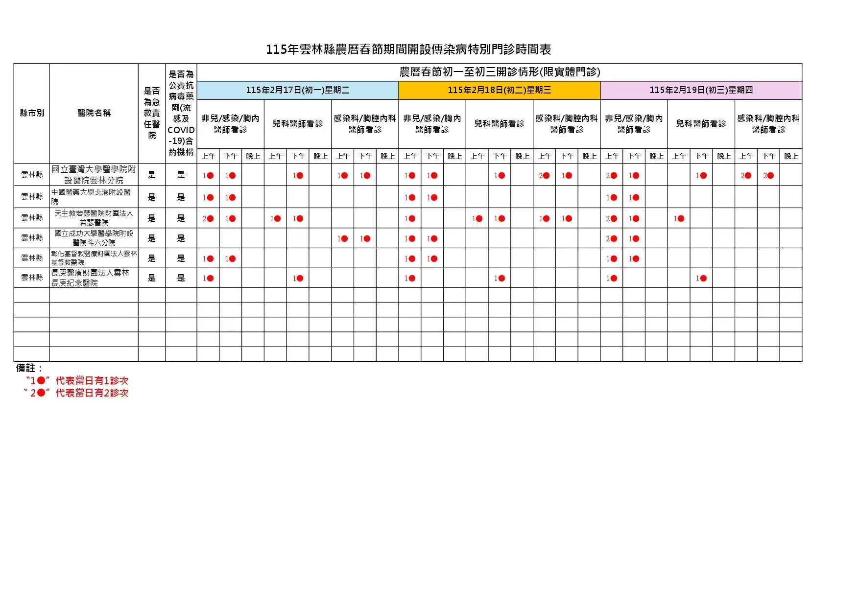 此外,在急重症醫療方面,春節連假期間雲林縣6家急救責任醫院將全面維持24小時急診服務,衛生局每日即時掌握各院急診候診及待床情形,與責任醫院密切合作、即時應變,確保急重症患者獲得妥適照護,並於農曆初一至初三加開傳染病特別門診。