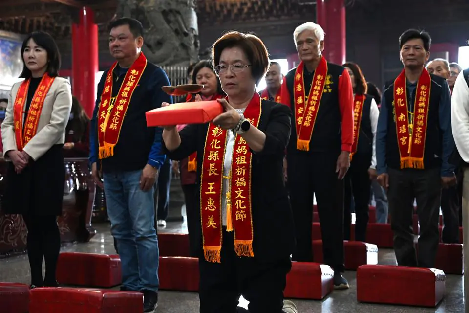 「2026彰化縣媽祖祈福文化節-擲筊求好日」活動,今(12)日上午在爐主宮廟芳苑普天宮盛大舉行,由彰化縣長王惠美擲筊請示今年彰化縣媽祖祈福文化節辦理吉日,在芳苑普天宮主委徐明戰、芳苑鄉長林保玲,與來自員林福寧宮、二林仁和宮、王功福海宮、鹿港台灣護聖宮、伸港福安宮、彰化南瑤宮、芬園寶藏寺、社頭枋橋頭天門宮、田中乾德宮、北斗奠安宮、埤頭合興宮、溪湖福安宮等共 13 間媽祖宮廟主委與各界嘉賓的共同見證下,擲筊請示媽祖。王縣長表示,擲筊結果由媽祖賜予2聖杯,正式擇定國曆10月 9日至 11日(農曆8月29日至9月2日)連續3日舉辦「2026彰化縣媽祖祈福文化節」,屆時13間宮廟媽祖神尊將集結於爐主宮廟芳苑普天宮,供信眾參拜,讓民眾一次就可獲得13尊媽祖的神力加持和庇佑。