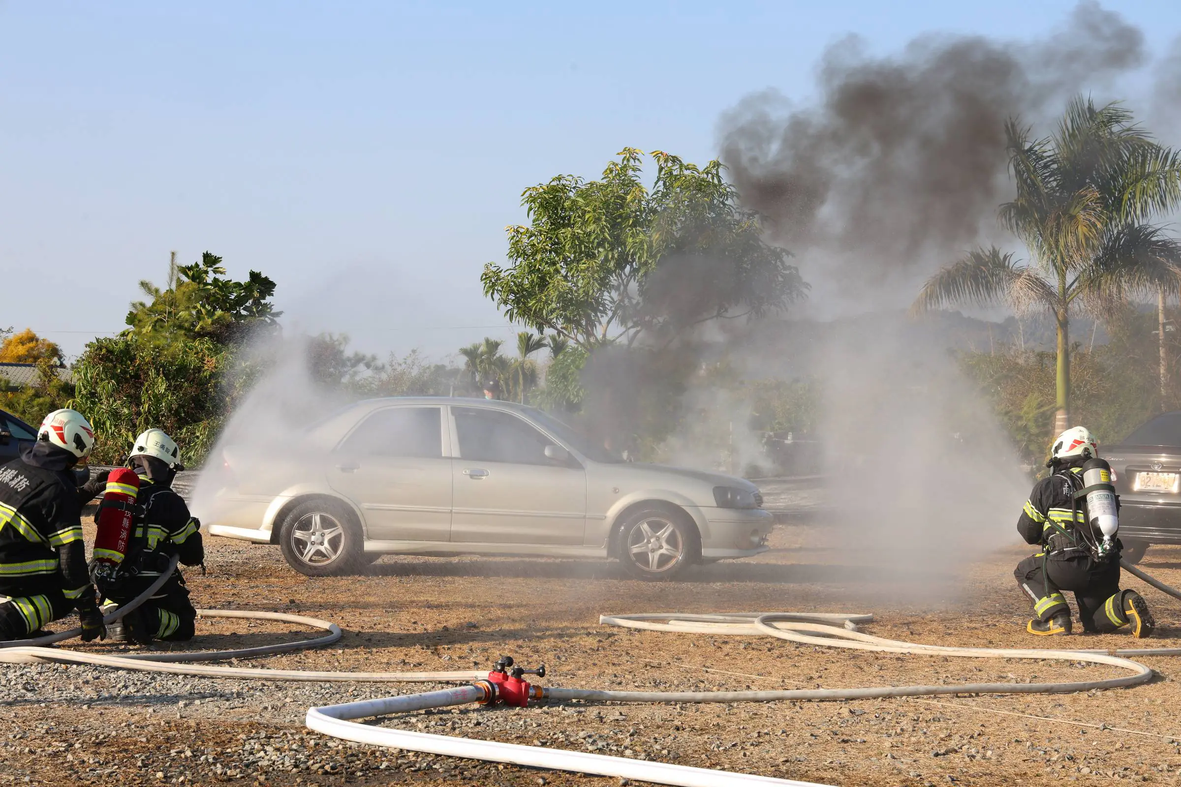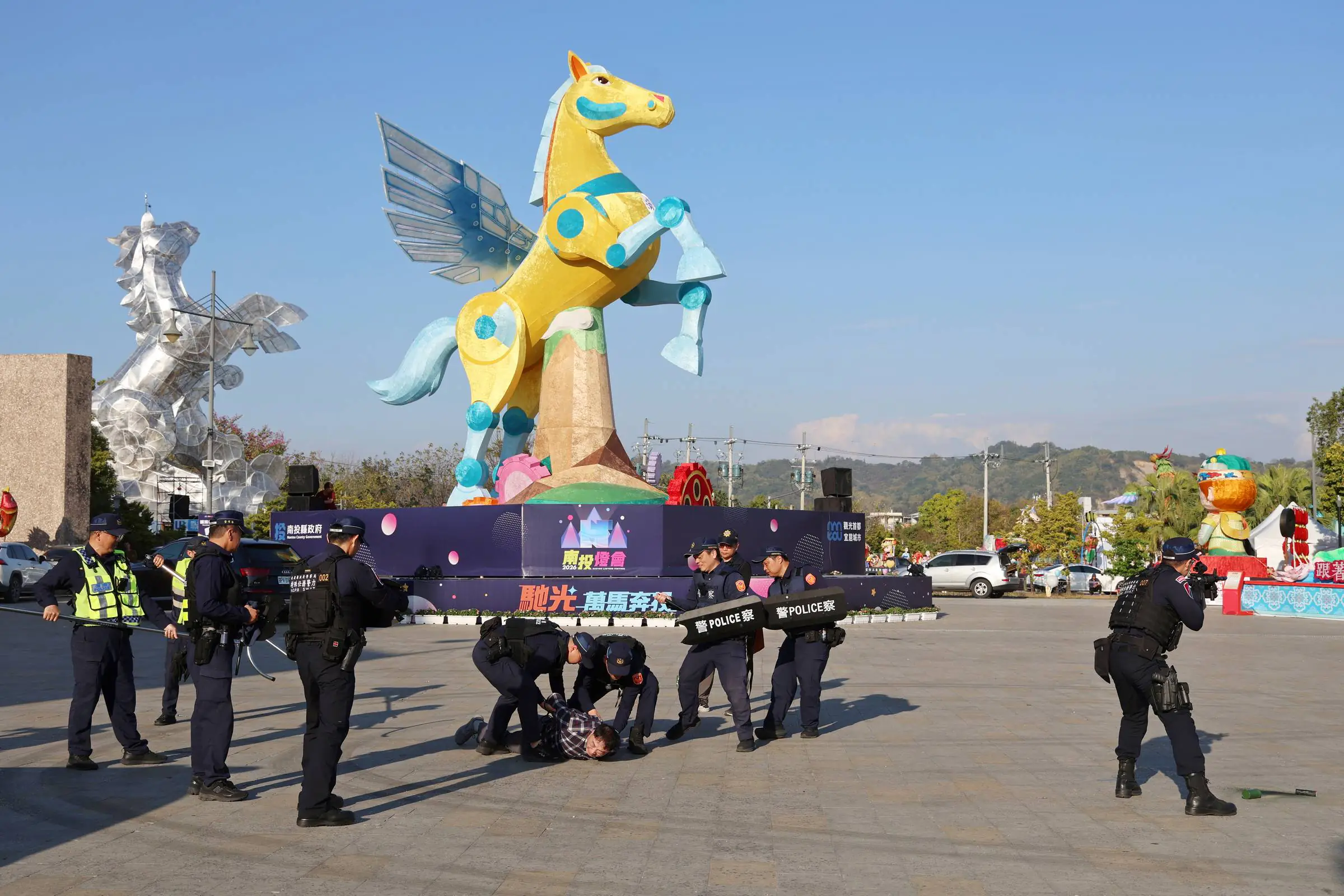 為增進並檢測「2026南投燈會」活動期間緊急應變維安能力,南投縣政府12日下午在南投縣農工商會展中心燈會展場舉辦安全維護演習,結合警察、消防、衛生、政風及觀光等局處人員,模擬演練歹徒縱火並持刀傷及民眾等狀況與應變排除作為,副縣長王瑞德全程督導,嚴格要求各單位藉此檢測強化突發緊急事件橫向聯繫與應變技能。