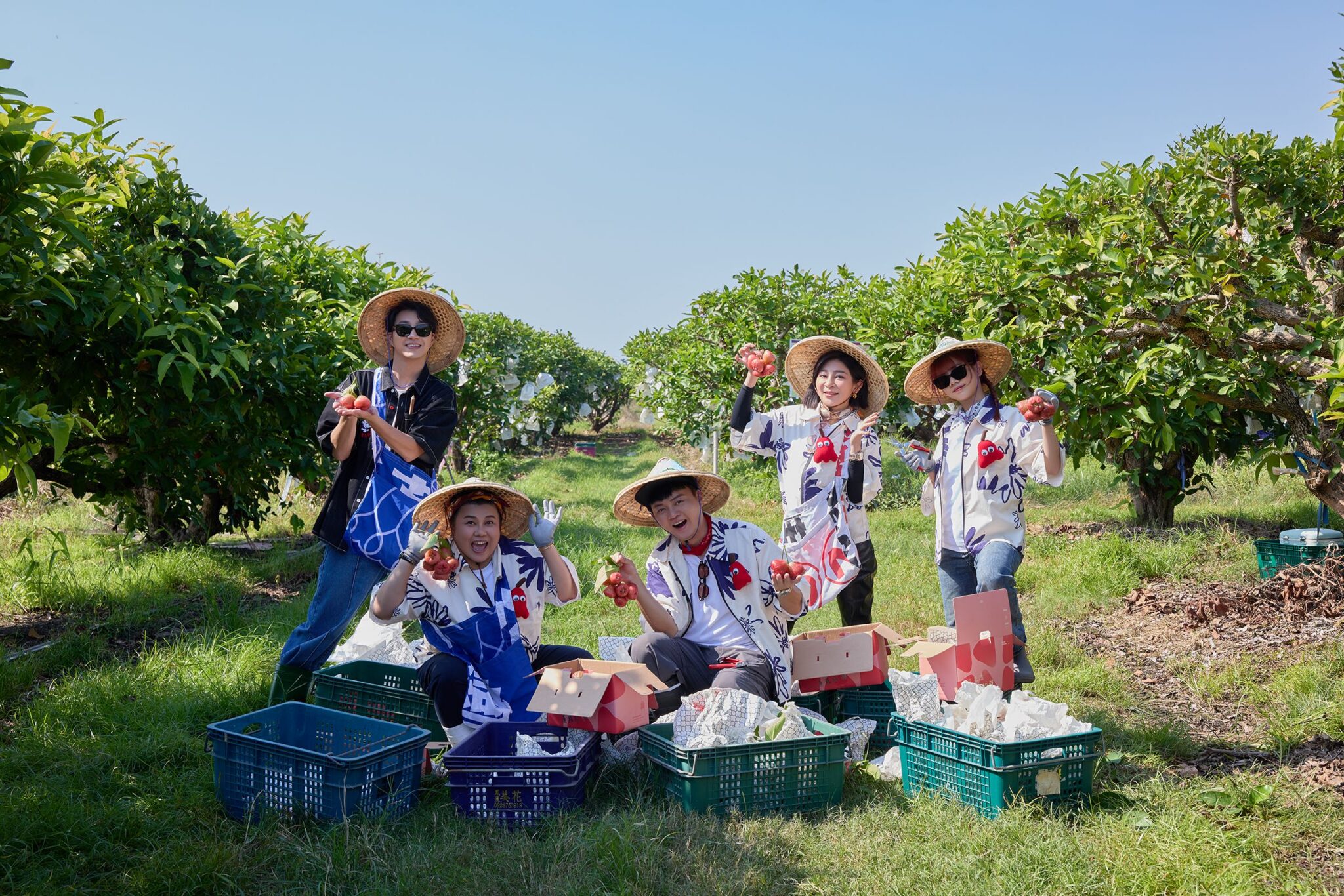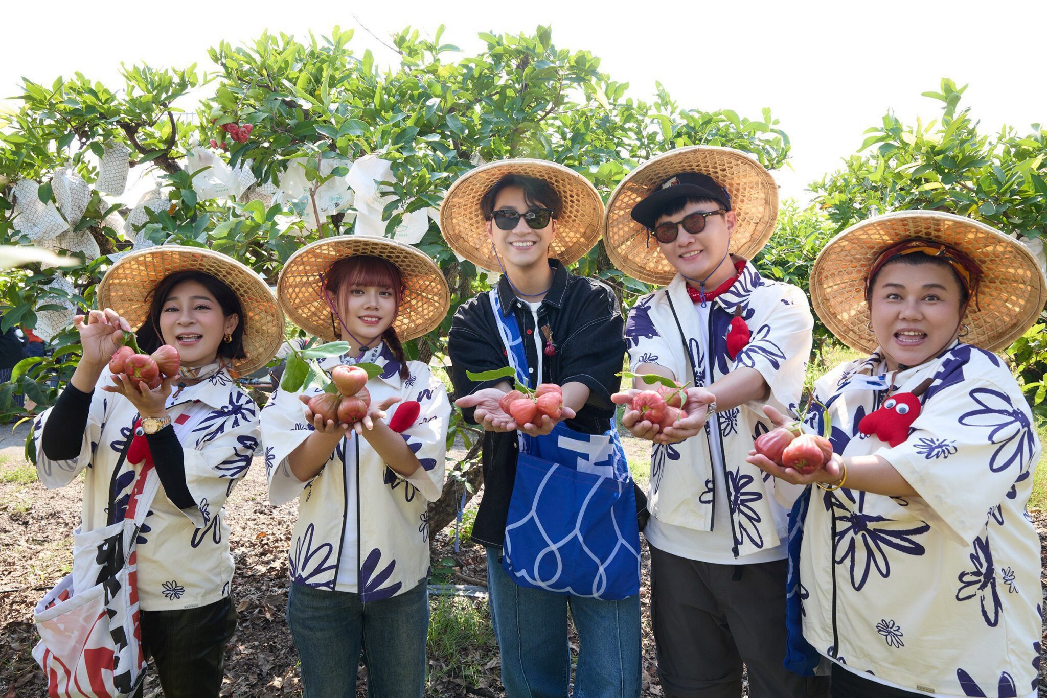 江宏傑(左起)林美秀、許富凱、王彩樺、黃于庭(庭庭)練習如何正確採收蓮霧 照片提供:三立電視