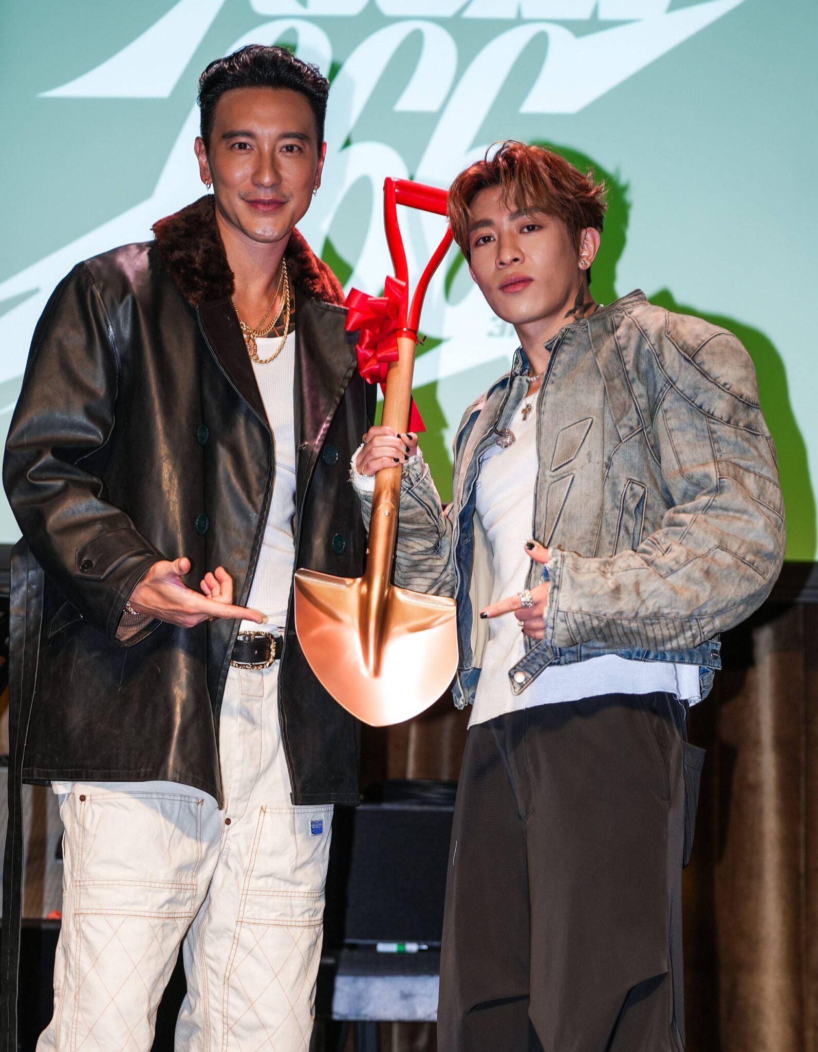 Tyson Yoshi(右)發行新專輯、王陽明(左)贈金鏟子祝作品生子都能量產     照片資料提供:想不到音樂工作室