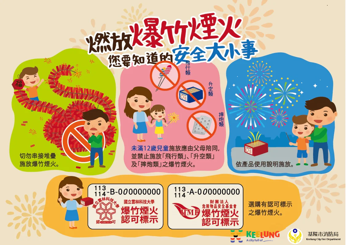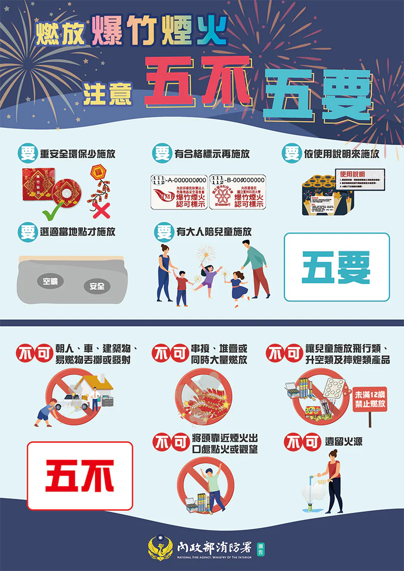 在爆竹煙火施放安全方面,請民眾遵守「五要五不」原則:要重安全環保少施放、要有合格標示再施放、要依使用說明來施放、要選適當地點才施放、要有大人陪兒童施放。