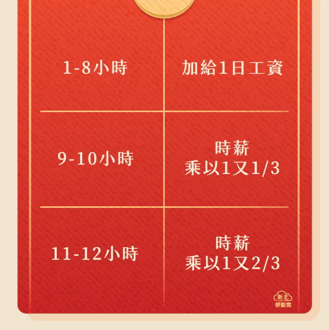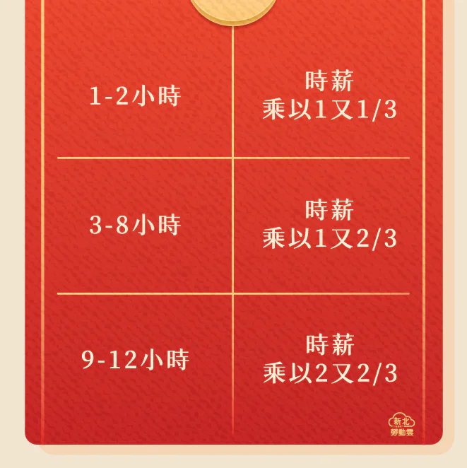 2月14日、21日為休息日,除當日工資照給外,如當日出勤在2小時內,每小時應按平日每小時工資額至少再加給1⅓倍,但出勤超過2小時者,則第3至8小時每小時應按平日每小時工資額至少再加給1⅔倍。