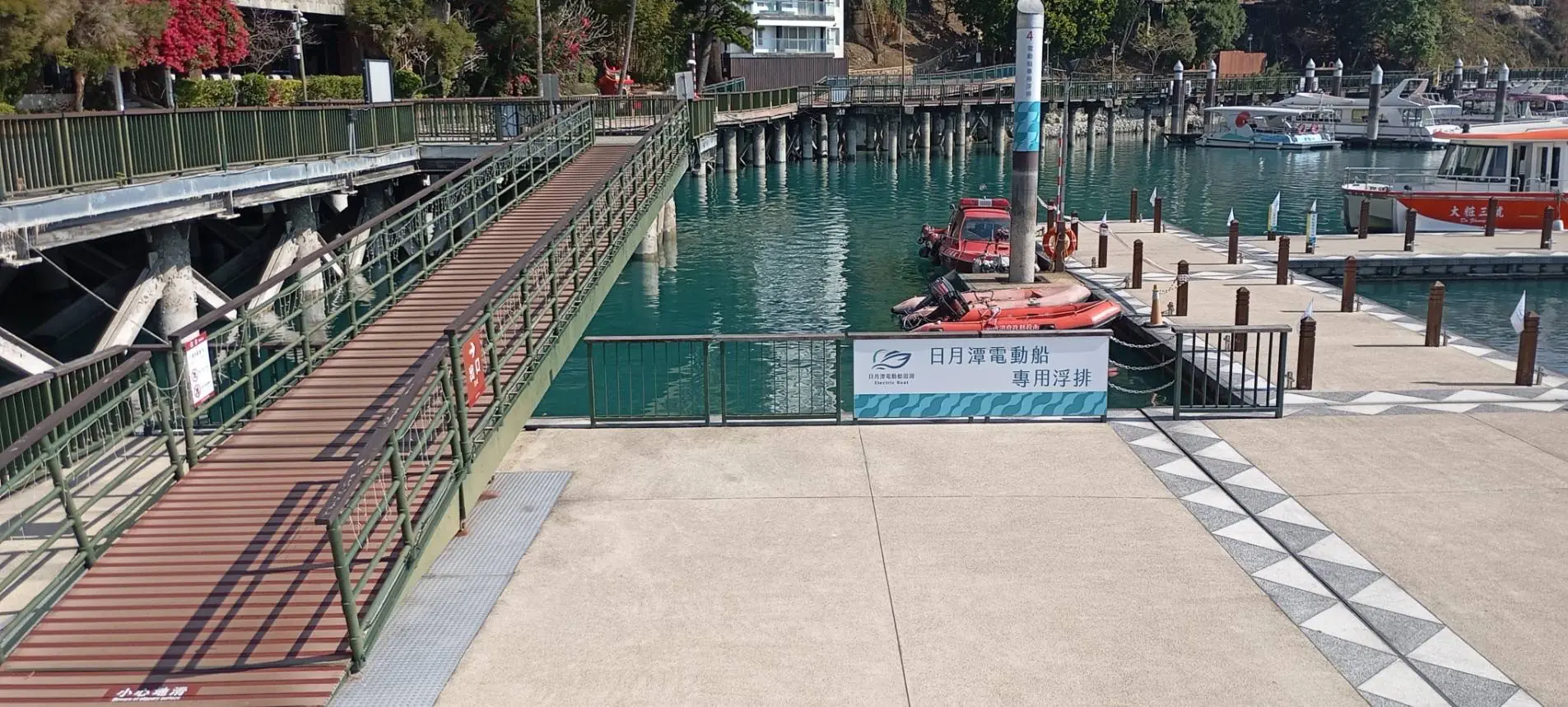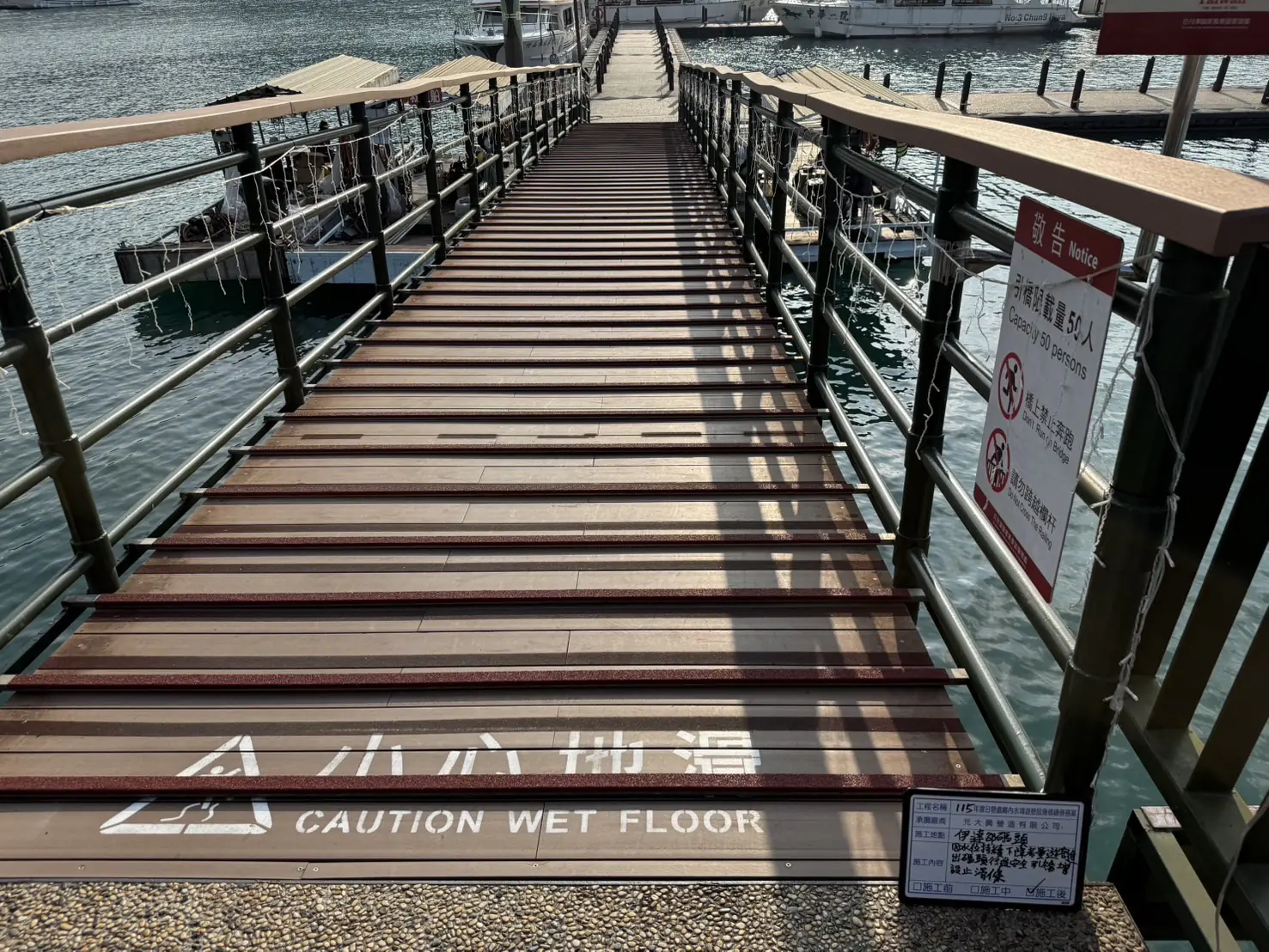 由於水位下降導致碼頭引橋傾斜度增加,為避免遊客因橋面濕滑或坡度過大發生意外,日管處刻正於四大碼頭實施面潭左側引橋全面裝設防滑設施,增加踏步摩擦力,提供遊客更穩固的行走環境;而考量防滑設施不利輪椅族、推車及行動不便者使用,面潭右側引橋仍維持原有斜坡道設計,並將由現場保全人員加強引導與協助,以兼顧通行安全與無障礙需求。