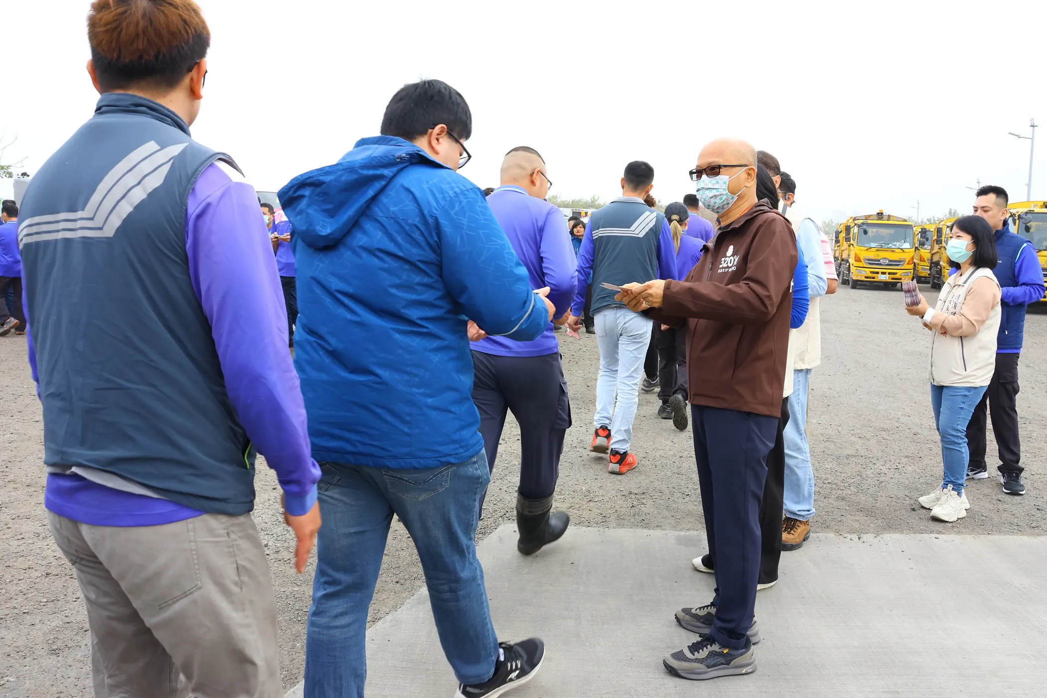 陳永豐除向全體辛勞的清潔隊員致上誠摯謝意、一一為出勤的垃圾車隊加油勉勵,也致贈全體同仁「粉紅超馬」新春紅包,並送上30箱象徵大吉大利的茂谷柑與5箱桶裝水,慰勞這群默默付出的城市英雄。