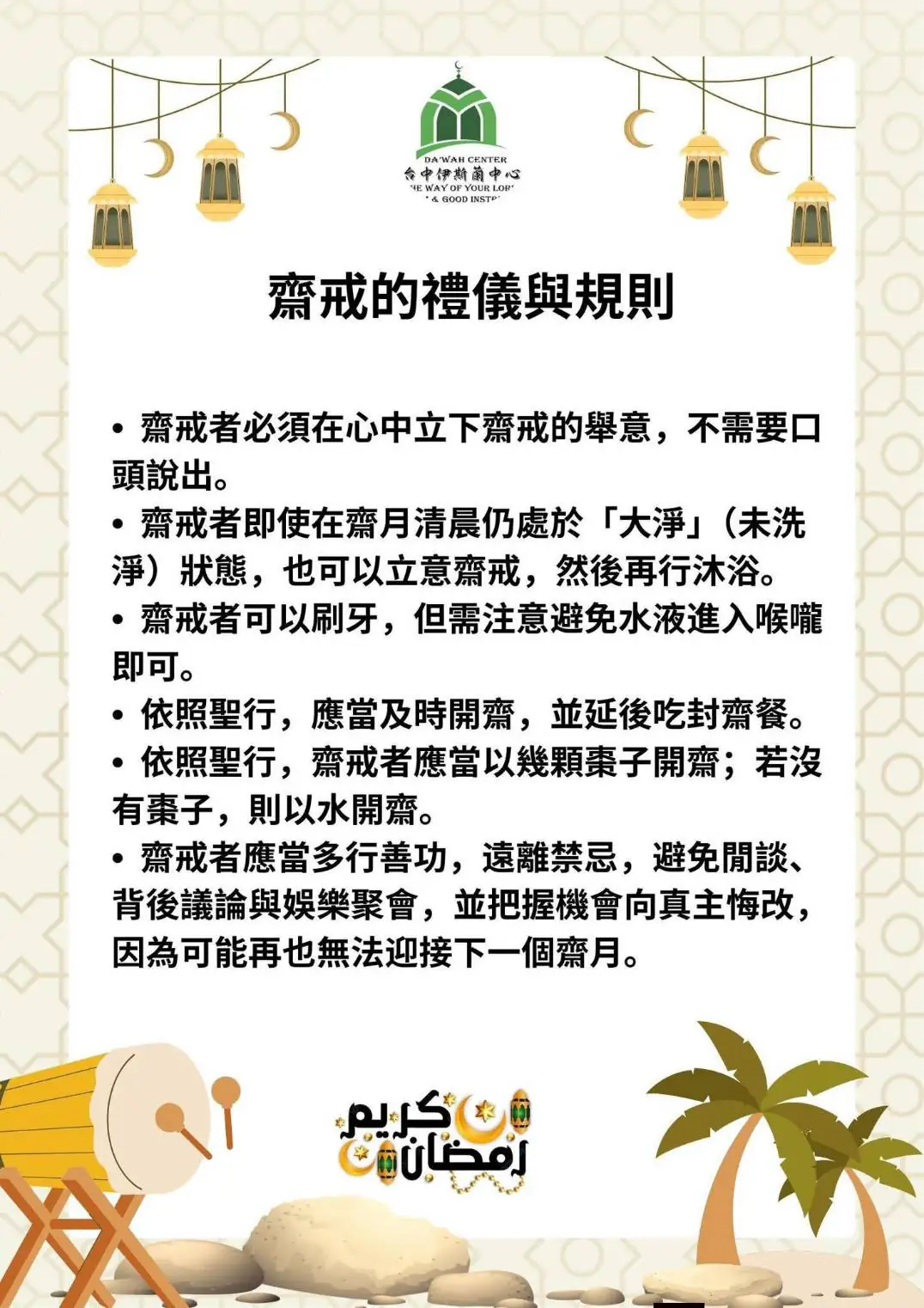 RAMADAN齋戒月是全球20億穆斯林最期待最尊貴的月份,所有穆斯林在齋戒月中每天從晨禮到日落期間停止飲食,實行齋戒對穆斯林有著心靈、精神及社會等多重意義。財團法人台中伊斯蘭清真寺教長保孝廉表示,齋戒不是只有不吃不喝,穆斯林還必須遵守齋戒的禮儀與規則(醫療),同時不從事使齋戒失效的行為,才是合乎教法的齋戒功修。