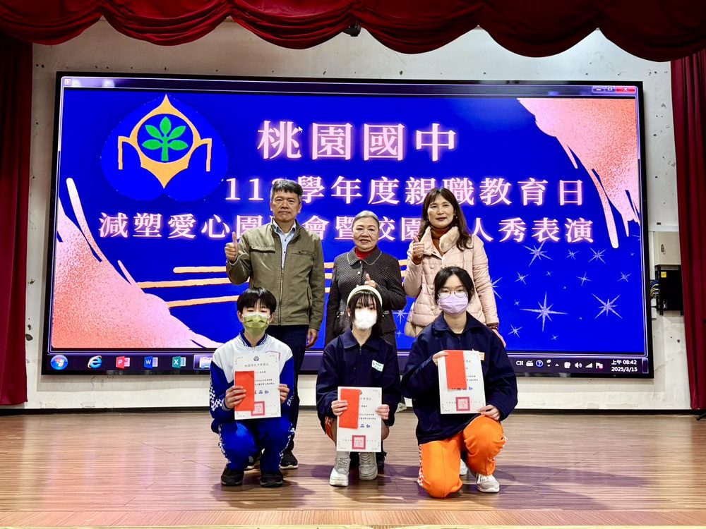 桃園國中親職教育日暨減塑愛心園遊會不僅是一場成功的校園盛會,更是全校師生攜手實踐環保的最佳見證,為社區帶來正向影響,也為永續發展貢獻一份力量。園遊會當天,並有校友王碧雪女士頒贈優秀學子獎學金及市議員黃家齊議員蒞校勉勵,一同見證桃園國中的優質。
