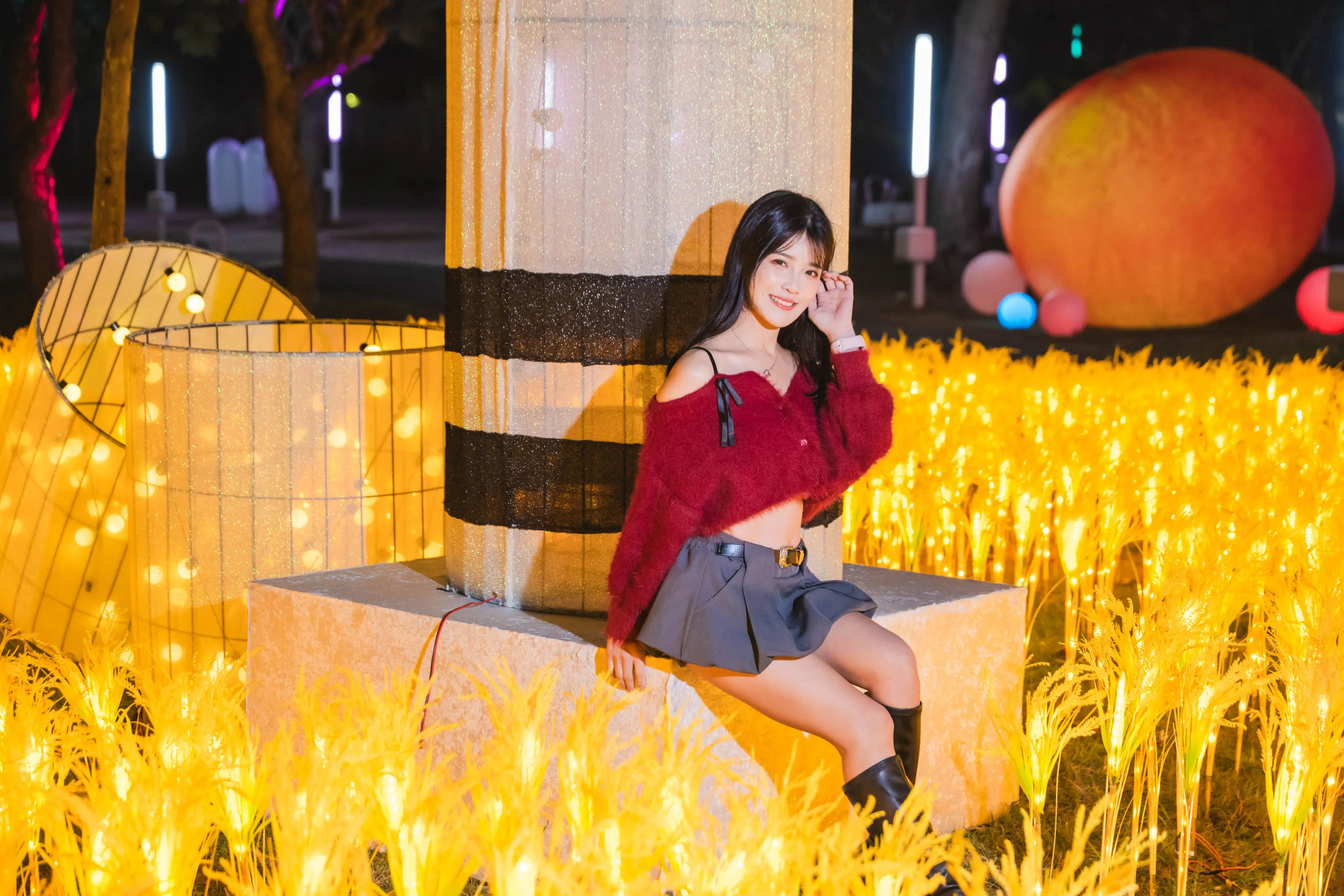 此外,屯區以霧峰益全香米釀造的「初霧‧純米吟釀」清酒燈組結合金黃稻穗,象徵豐收與甘甜生活;城區則以中區中山路舊稱「鈴蘭通」為發想,高掛鈴蘭花燈並融入夜市小吃文化,其中啵啵雲喝珍奶坐在草地上的俏皮造型,更成為遊客必拍的療癒打卡亮點。