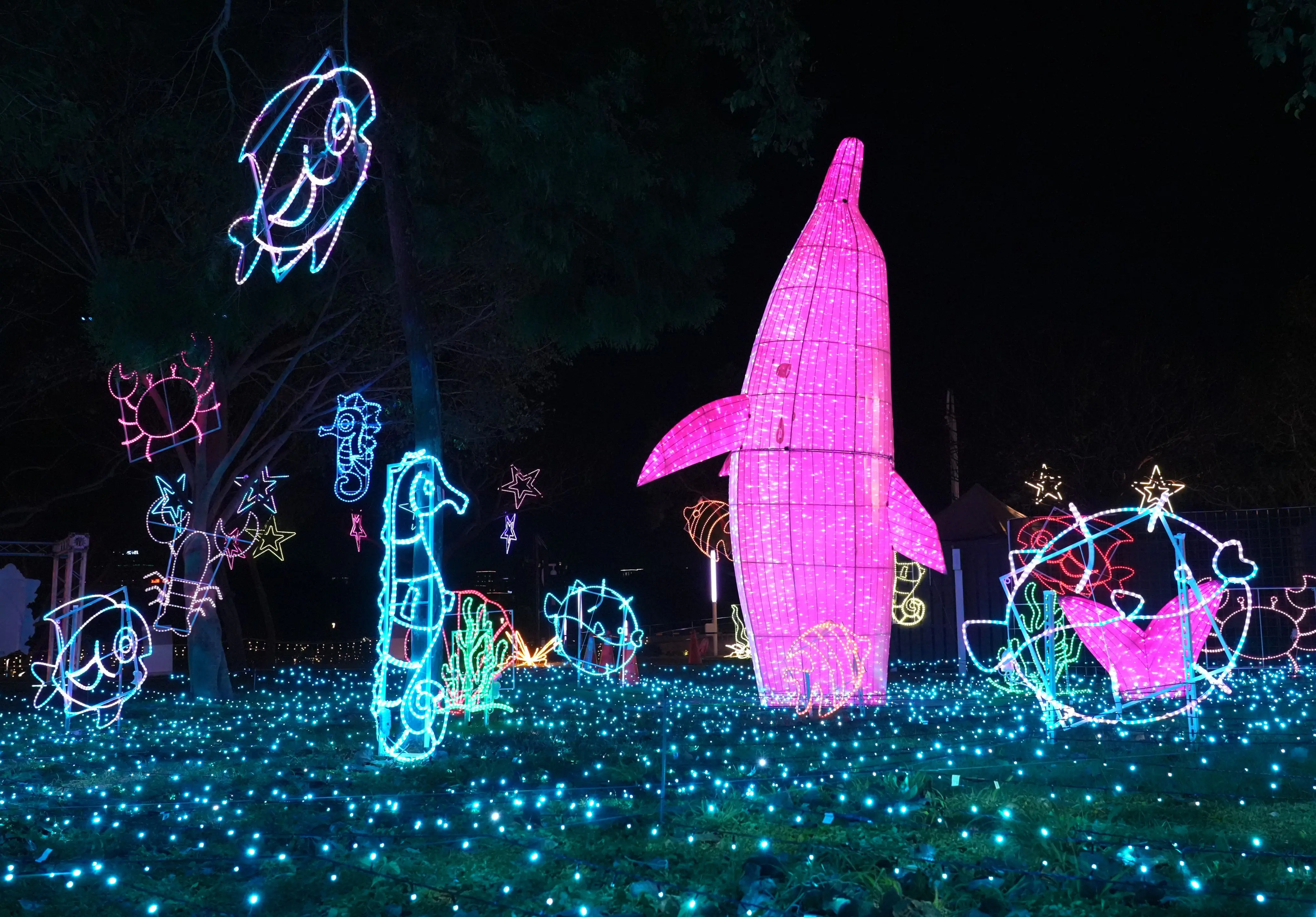 吳局長指出,「幸福祈願村」透過四大祈福燈組呈現山、海、屯、城的城市意象與信仰文化特色,讓民眾一走進燈區,就能感受滿滿祝福與「神力」加持。展區同時規劃代表四大區域的特色燈組,其中山城以巨型水蜜桃、蜜蘋果、椪柑、甜柿及甘露梨展現豐饒果香;海線則以日前現身台中港的白海豚為主角,年長白海豚活動時身體會透出淡粉色光澤,且常於農曆三月媽祖誕辰前後出現,被漁民稱為「媽祖魚」,象徵守護海洋、平安吉祥,也為燈區增添溫暖祝福意象。