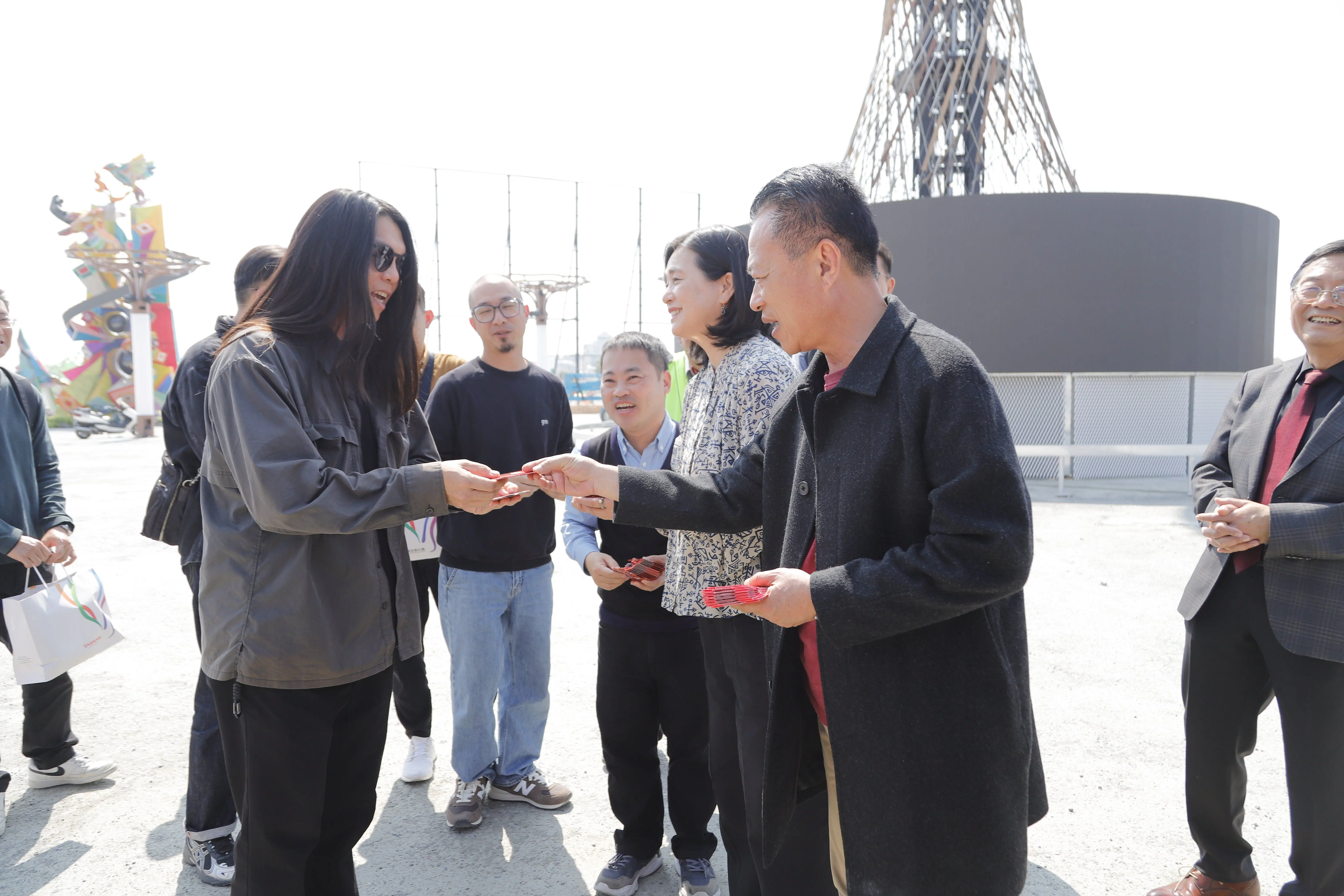 大年初五開工,嘉義縣長翁章梁、觀光署長陳玉秀等人今21日齊聚2026台灣燈會主燈「光沐—世界的阿里山」前進行開工祭拜,並發紅包給在場工作人員,盼燈會一切平安、圓滿。