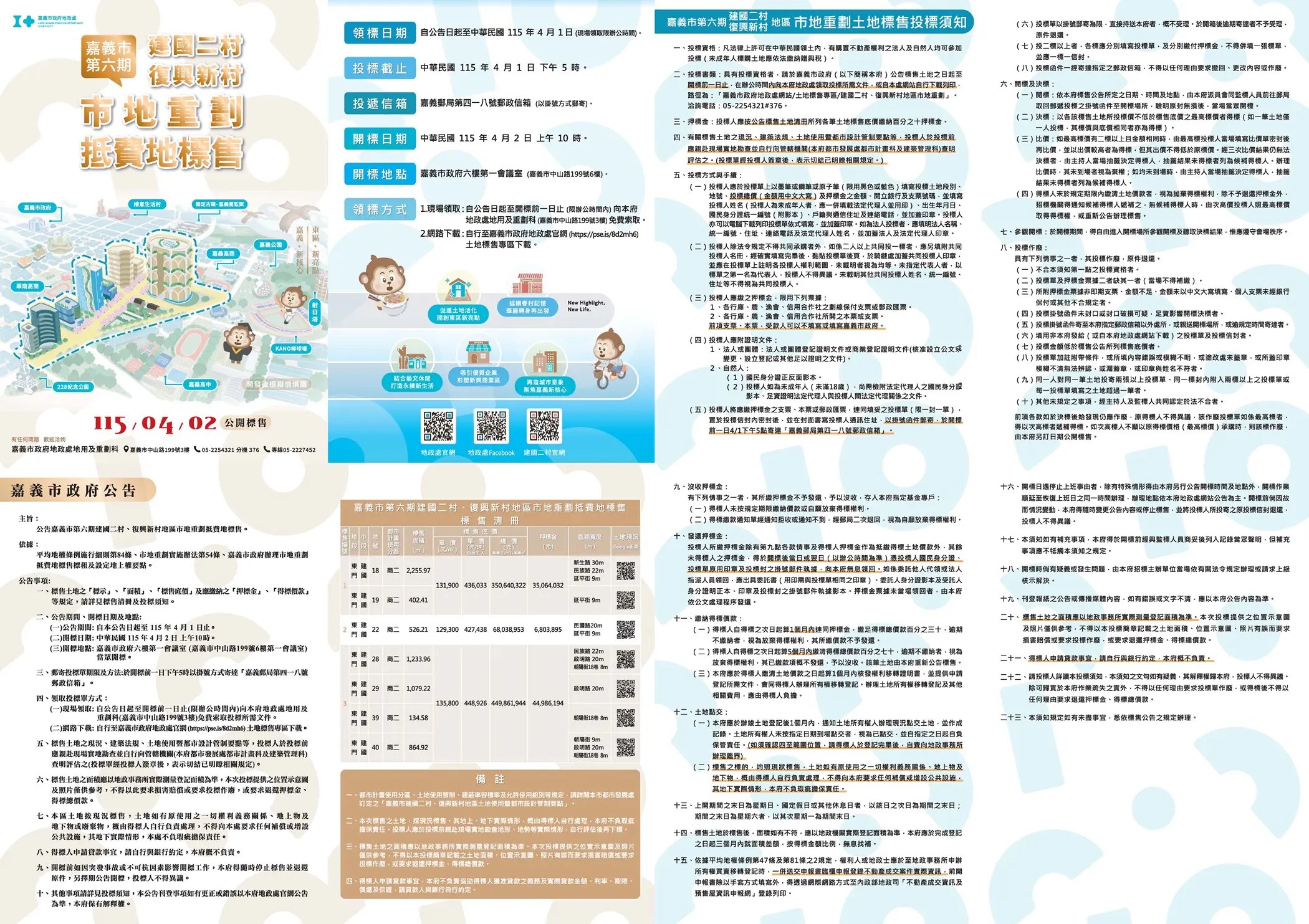 眾所矚目的「嘉義市建國二村、復興新村地區市地重劃抵費地標售」正式啟動,嘉義市政府將於115年2月25日公告標售,並訂於115年4月2日上午10點,在市府六樓第一會議室辦理公開開標,歡迎有意投標民眾踴躍參與。