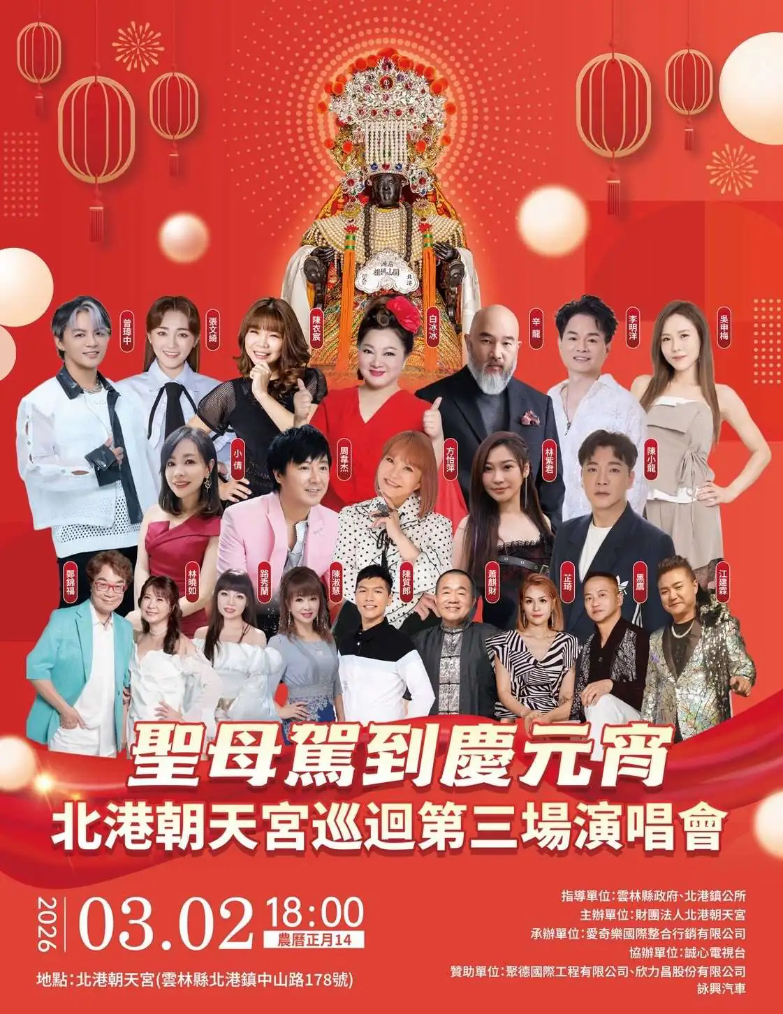 文化觀光處補充,為即將迎來的元宵節,北港燈會更有一系列活動,北港武德宮於3月1日將舉辦「千燈照上元,武德新唐社成立週年雅集」,屆時將有近50位身著唐代華麗服飾的型男仕女們,提燈遊行於北港古鎮內,財團法人笨港媽祖文教基金會於3月2日舉辦「115年『駿馬呈祥慶元宵』之千人提燈大型元宵踩街活動」,以及北港朝天宮於3月2日舉辦「聖母駕到慶元宵-北港朝天宮巡迴第三場演唱會」,誠摯邀請大家一起走進「2026北港燈會-潮光潮」,在光的引領下,遇見北港,也遇見一段屬於自己的美好回憶。