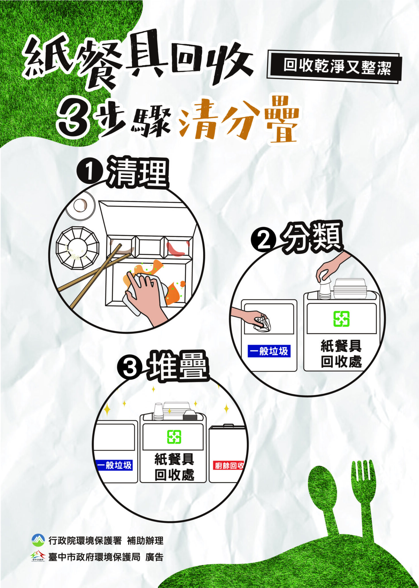 環保局也提醒紙餐具回收有三步驟,「清、分、疊」。第一「清理」,請民眾務必清除內容物及廚餘,並稍做沖洗或擦拭;第二「分類」,請落實垃圾、廚餘、回收(餐具)分類;第三「堆疊」,請將相同類型的紙餐具堆疊減積,一般紙容器(如牛奶盒等)回收時也請清除內容物並壓扁減積。為養成市民隨手做分類的好習慣,此次活動如市民持未經清除內容物、且未堆疊壓扁的紙容器,將不提供兌換。