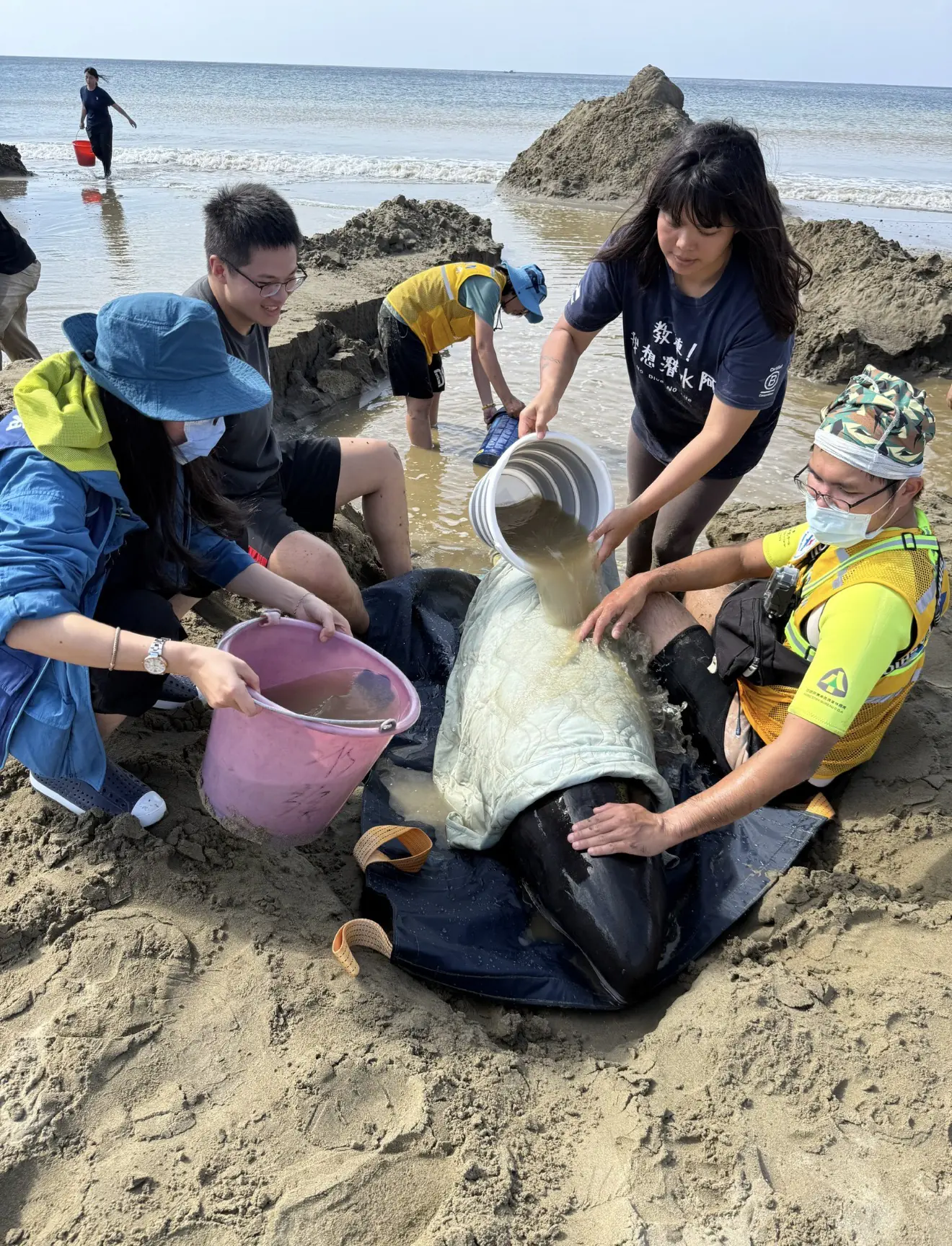 圖説:海保署救援小虎鯨爲其皮膚保濕。(海委會提供)