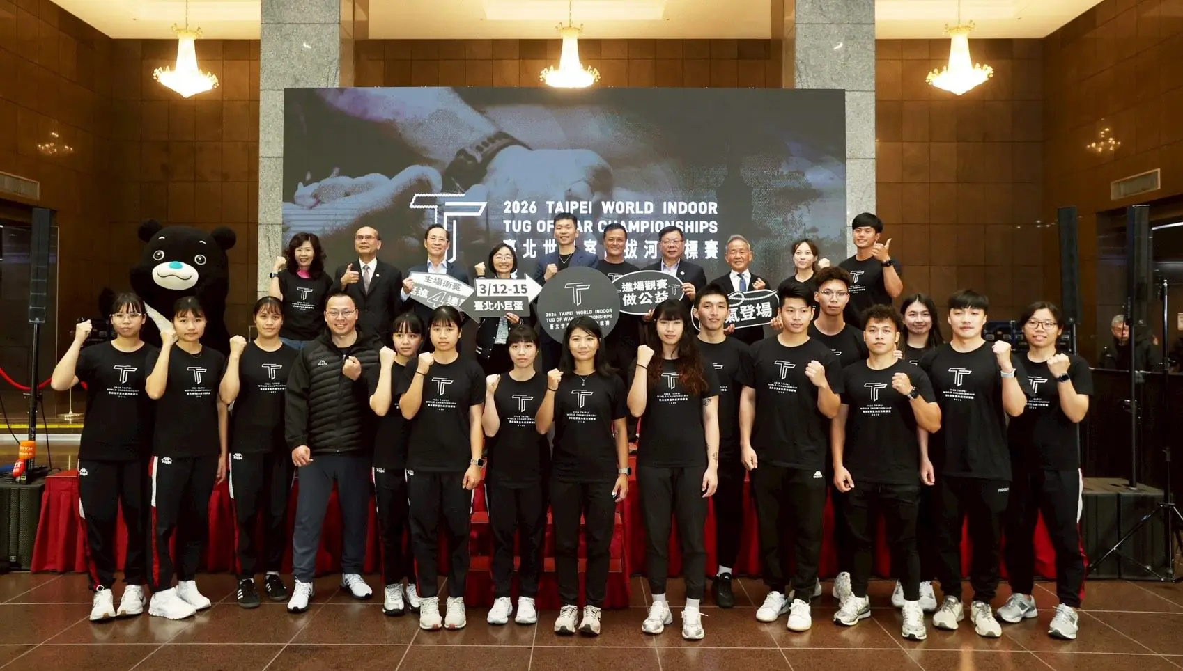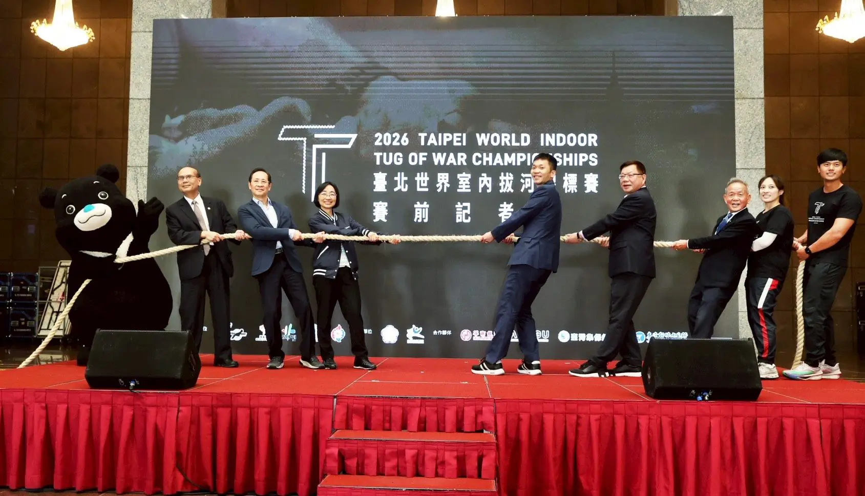 記者會由景美女中樂儀隊以氣勢磅礡的演奏揭開序幕,隨後貴賓與國家隊成員合力點亮數位繩結,並透過大型LED揭曉賽事LOGO,傳達「一條繩,拉近全世界」的賽事核心意象;象徵臺灣以運動為橋梁與國際接軌,讓世界看見我國深厚的競技底蘊與成熟的辦賽能量。臺北市吉祥物「熊讚」也與貴賓及選手合擺經典拔河戰姿,展現主辦城市的熱情與拚戰決心,現場氣氛熱絡。