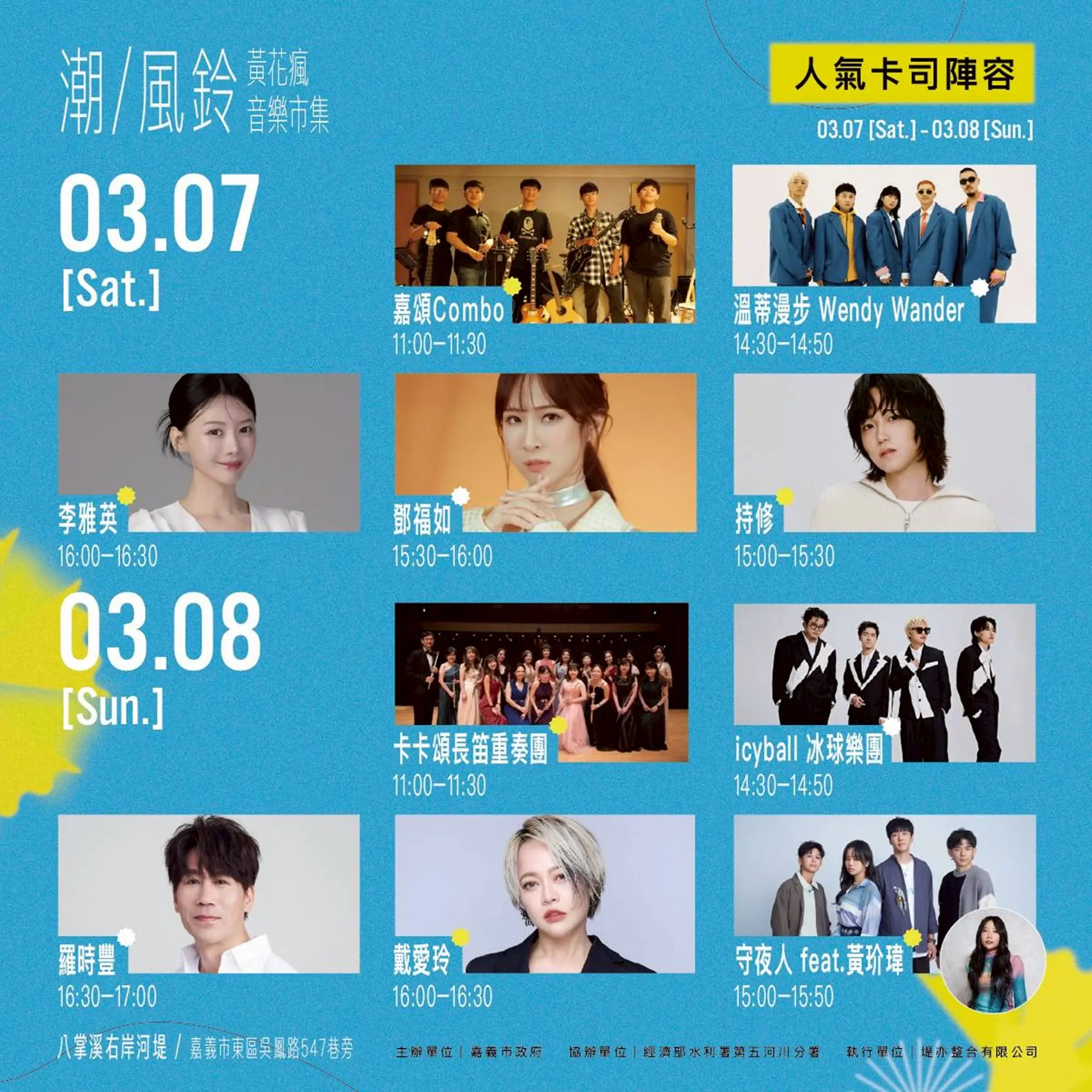 黃敏惠進一步表示,市府去年推出「潮風鈴˙野餐音樂市集」,短短2天吸引超過10萬人次前來共襄盛舉,今年活動再升級,卡司陣容堅強,由嘉義在地的嘉頌重奏團率先帶來溫暖動人的樂音,為整場活動揭開序曲。多組人氣歌手與樂團輪番登台,包括新生代創作歌手持修、嗓音清亮動人的鄧福如、擁有獨特音樂語彙與深刻情感的守夜人與黃玠瑋,復古浪漫氛圍滿溢的icyball 冰球樂團、以療癒旋律圈粉無數的溫蒂漫步,以及唱功爆發力十足的戴愛玲。壓軸更邀請羅時豐與李雅英熱力登場,多元曲風橫跨流行、創作與樂團演出,為花季增添不同層次的聽覺驚喜。