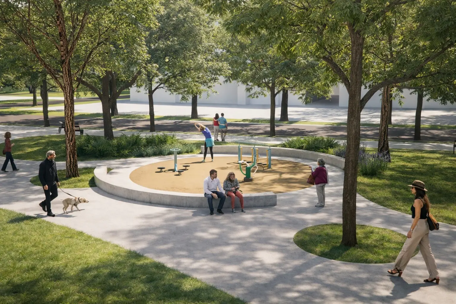 此外,園內也同步設置體健設施區,提供成人與長者進行簡易運動與伸展,照顧全年齡層的健康需求,另原有的涼亭與花架亦被妥善保留並整合更新,搭配新增座椅、環狀步道與綠蔭植栽,形塑舒適宜人的休憩動線,無論是散步聊天、社交聚會或日常活動都相當合適。加上園區內設有YouBike站點,民眾可輕鬆騎乘自行車前來,串聯周邊社區與生活圈,提升整體使用便利性與使用率。