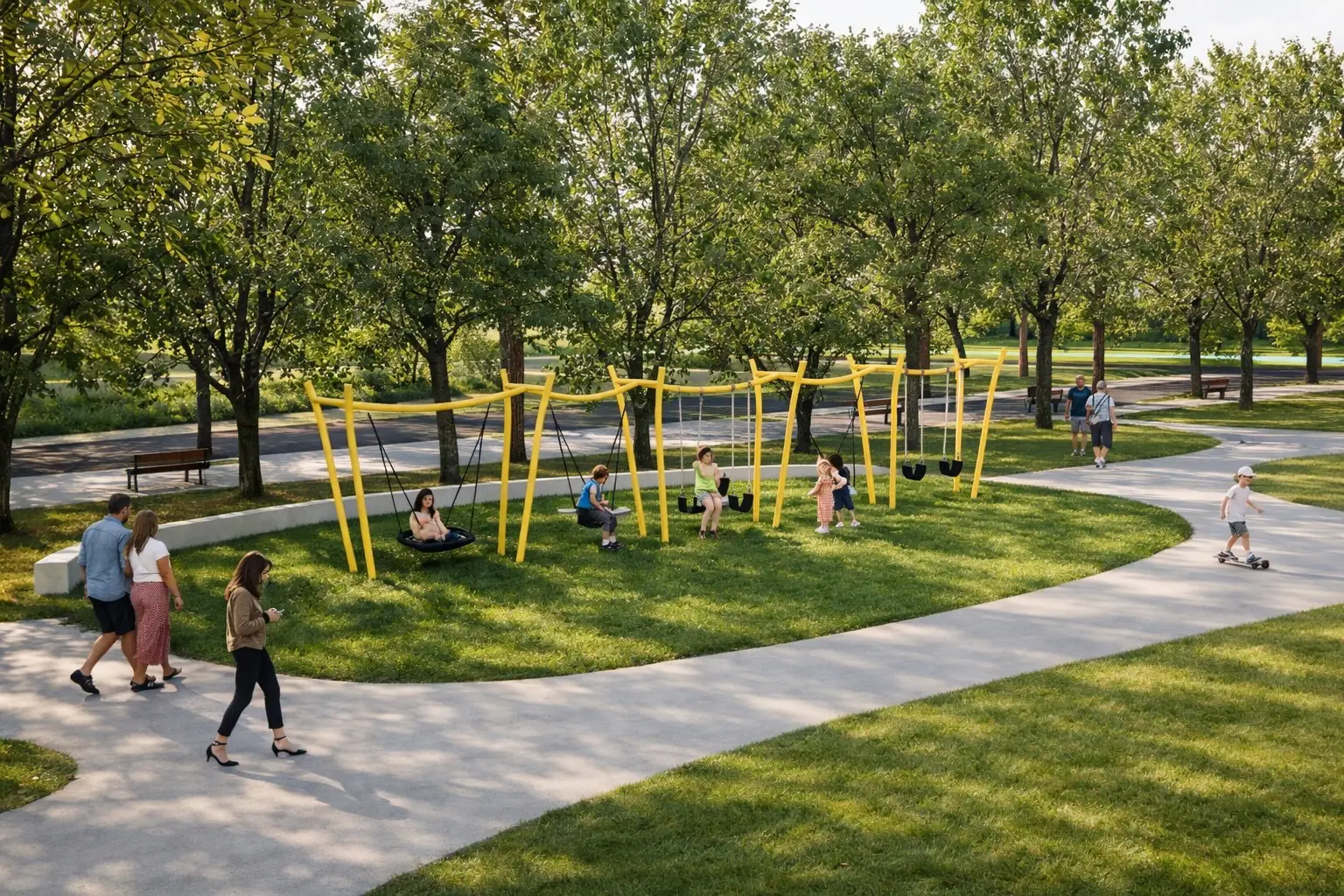 在設計上,園區將保留原有綠地的開放感,讓市民即使身處城市,也能感受到綠意環繞、放鬆身心的慢活氛圍,成為日常生活中的「療癒角落」。公園處進一步說明,為滿足不同年齡層需求,園區北側特別規劃全齡共融遊戲場,集結多樣化遊戲設施,包括共融鞦韆、攀岩遊戲組、磨石子滑梯、木頭攀爬組及搖搖設施等,讓不同年齡、不同能力的孩童都能一起玩、安心玩,實踐友善、安全又包容的遊戲理念。