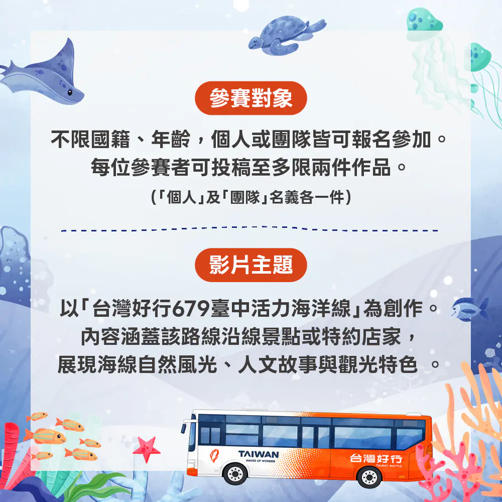 活動投稿資格不限年齡與國籍,個人或團隊皆可報名參加,投稿期間自即日起至115年4月20日止。誠摯地邀請拿起鏡頭,記錄海線獨有的生活節奏。得獎名單預計5月15日在「大玩台中」facebook粉絲專頁揭曉。台灣好行資訊可至臺中觀光公車專區查詢 https://reurl.cc/4bx18j 。 報名資訊可上 https://www.surveycake.com/s/M8Zkx 參閱查詢,或洽諮詢專線04–22010520。