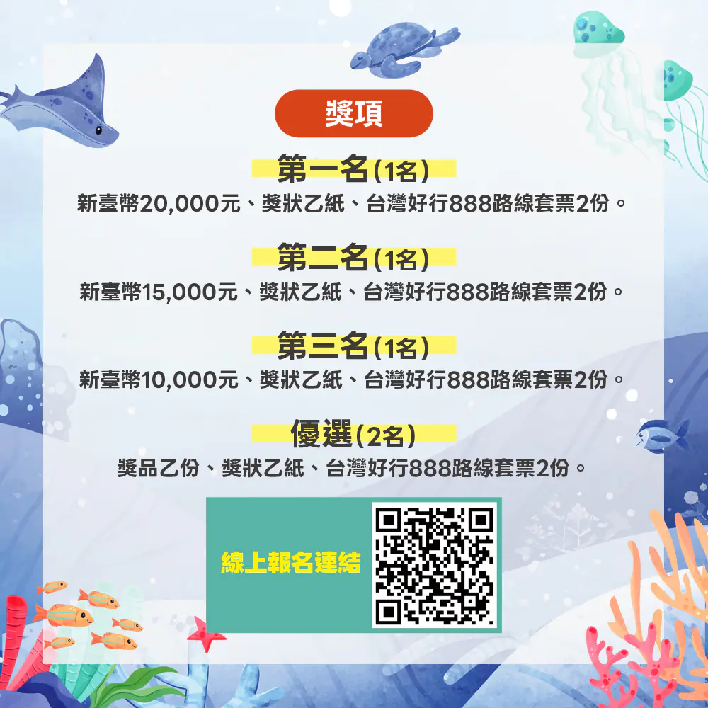 觀旅局指出,海線擁有深厚的人文故事與絕美的自然資源,無論是歷史悠久大甲鎮瀾宮或是近期很夯的台中海洋館都很值得到訪。為鼓勵優秀創作,活動獎項豐富,第一名可獲得2萬元獎金及台灣好行888豐后線套票,總獎項包含前3名及優選「最佳海線景觀獎」2名。評審團將由業界專家學者組成,針對主題契合度、創意表現、影像品質等項目進行綜合評選,期待能發掘出最具共鳴與感動力的海線故事。