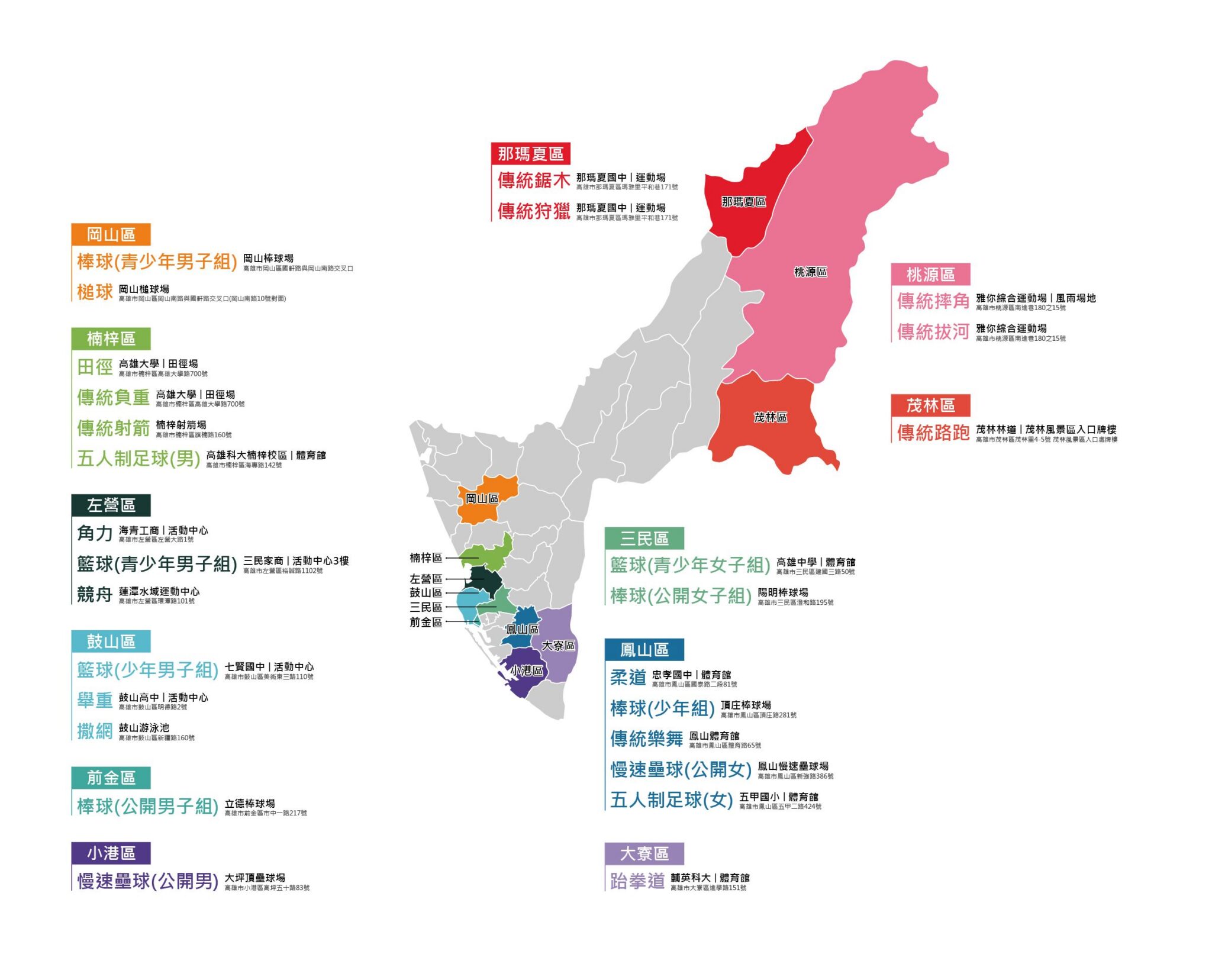 高雄市獨有臺灣原住民第15族(拉阿魯哇族)及第16族(卡那卡那富族),為全台少數16族族人皆有設籍居住之縣市,兼具豐富多元原民特色。且高雄境內茂林、桃源、那瑪夏三個原住民地區皆為競賽地點,茂林林道3月23日將舉辦「傳統路跑」;桃源區雅你綜合球場3月22日至3月23日將舉辦「傳統摔角」和「傳統拔河」;那瑪夏國中3月22日則是「傳統鋸木」和「傳統狩獵」的競賽場地。