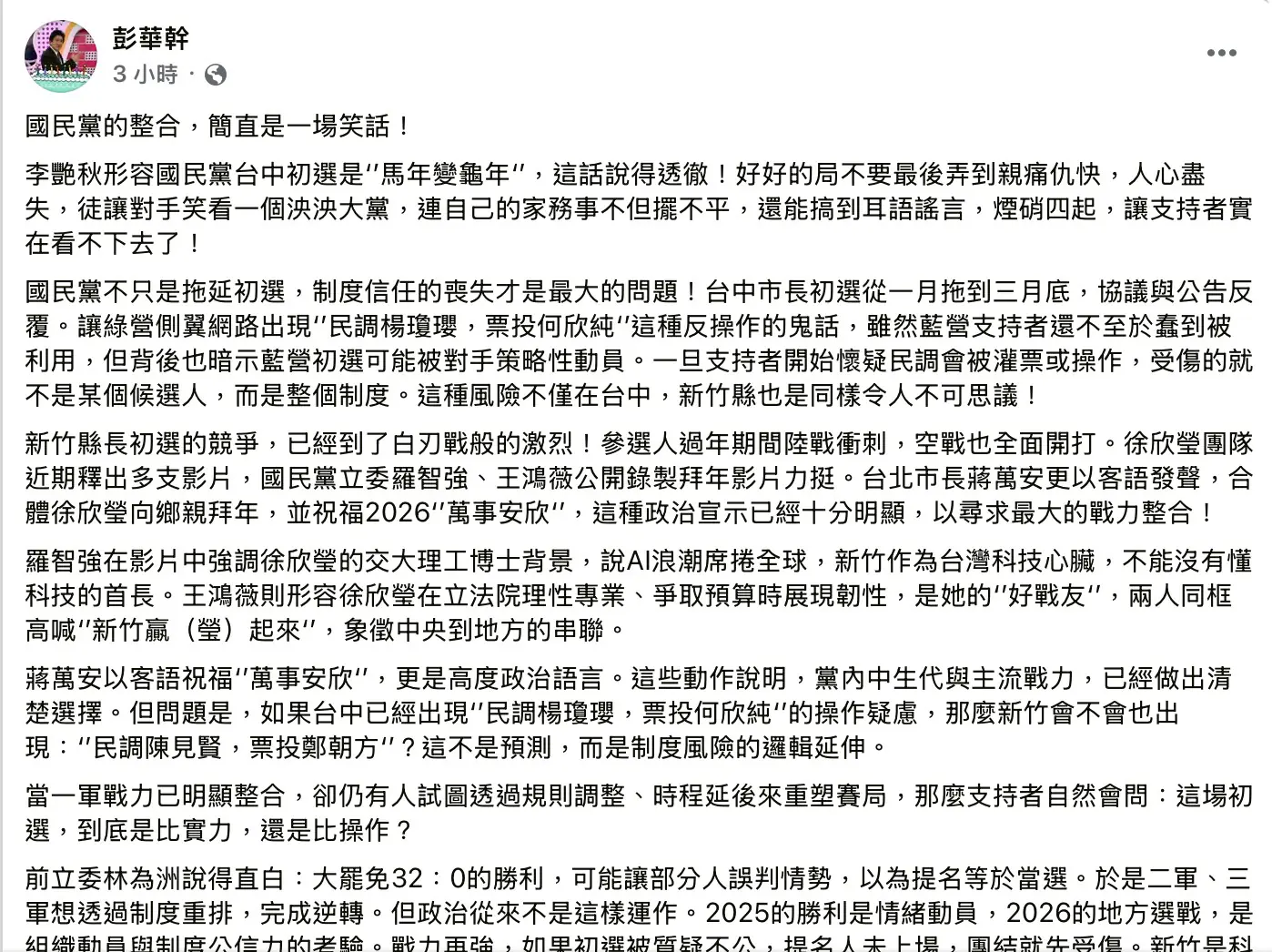 台中市長初選方面,立法院副院長江啟臣與立委楊瓊瓔競逐提名,民調時程多次延後至3月25日至31日辦理,引發支持者議論。彭華幹引述媒體人李艷秋「馬年變龜年」的評論,指出問題核心不在拖延本身,而在制度是否讓基層產生疑慮。他提到,網路流傳「民調楊瓊瓔,票投何欣純」說法,已顯示部分支持者擔憂民調可能遭策略性動員影響。