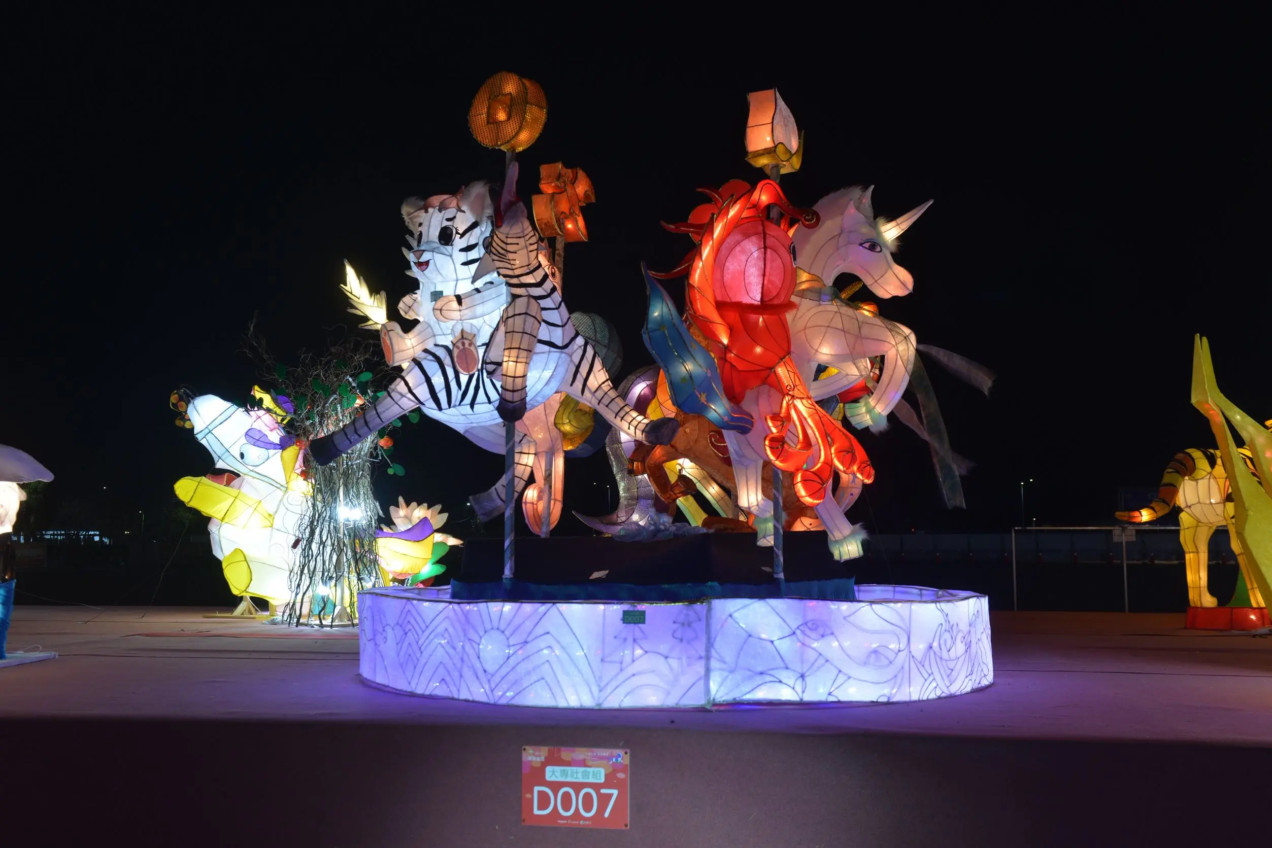 大專社會組由聯合創作坊 「祥瑞神獸轉木馬」奪得獎項,作品氣勢雄偉、結構堅實,燈光配置均勻明亮,展現極致工藝技巧與優雅視覺效果。