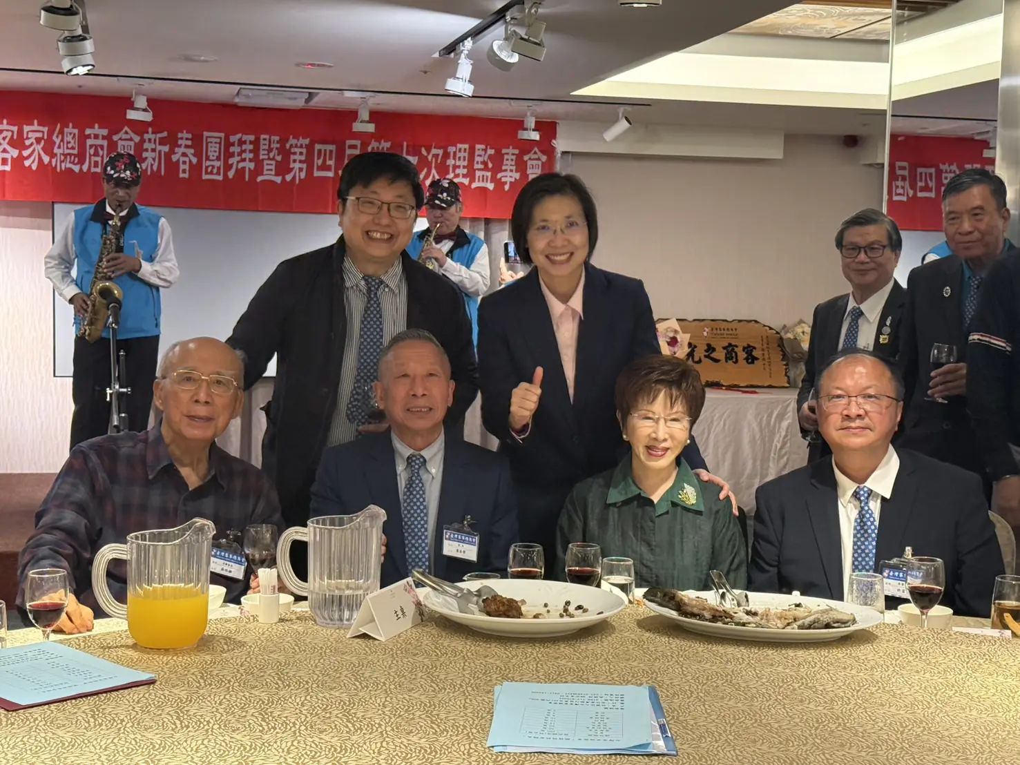 國民黨新竹縣長參選人、立委徐欣瑩日前出席「台灣客家總商會新春團拜」,前國民黨主席吳伯雄(伯公)(前排左一)及洪秀柱(右二)皆高舉雙臂,為徐欣瑩大喊「凍蒜」。圖/徐欣瑩辦公室提供