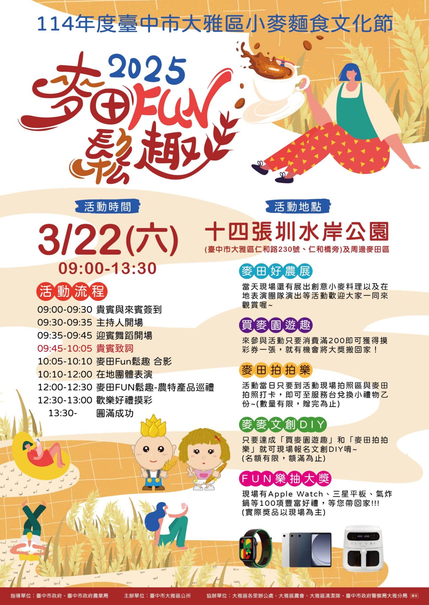 大雅區小麥麵食文化節「麥田FUN鬆趣」活動明(22)日將於大雅十四張圳水岸公園盛大開幕。台中市府觀光旅遊局表示,當日舞台區不僅有精彩表演,還匯集在地青農所組成的「麥田好農展市集」,將販售當季新鮮的農特產品,現場更設有「小麥麵食創意料理」、「麥麥文創DIY體驗」及「FUN樂抽大獎」,讓大家樂在其中,歡迎民眾前來感受大雅麥田的魅力。