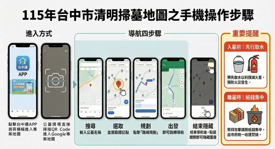 台中市生命禮儀管理處補充,民眾可於台中通APP首頁點選「台中市清明掃墓地圖」橫幅,或掃描專屬QR Code進入Google專案地圖,在搜尋欄輸入公墓名稱,點選紙錢集中處或消防水袋圖示後按下「路線規劃」,即可啟動導航;使用完畢後,可於地圖下方「查看地圖圖例」中關閉「115年清明地圖」選項,隱藏相關圖示,操作簡便,期盼透過數位工具的導入,讓市民在追思祭祖之際,也能兼顧便利、安全與環保。