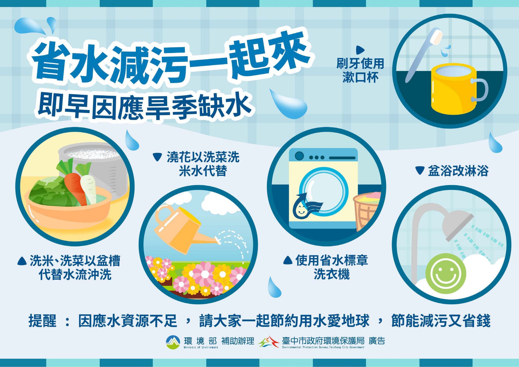 環保局長陳宏益表示,在日常生活中,刷牙使用漱口杯、以盆浴改淋浴、洗米或洗菜以盆槽代替水流沖洗,澆花以洗米洗菜水代替,使用省水標章洗衣機,可以節能減污又省錢。用餐後應去除廚餘及垃圾,餐具(碗盤等)使用後以廢紙(衛生紙)擦拭除油,可減少清潔劑使用及省水,即使是使用一次性免洗餐具稍微擦拭,亦可減少回收過程污染及回收處理用水,讓河川環境更美好。在環保方面,當空氣品質預報呈現橘色提醒等級時,清潔隊出動洗街車也會使用水資源回收中心的回收水進行洗街作業,重複使用水資源並降低空氣污染。