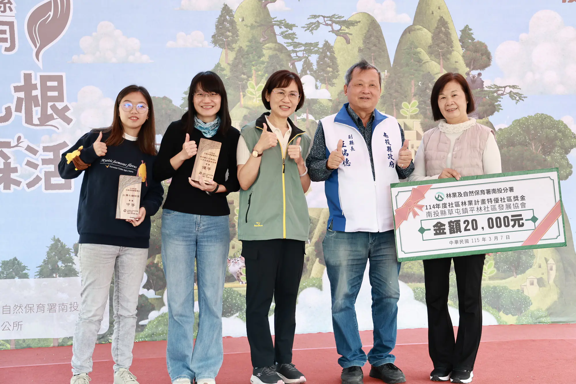 除王副縣長外,包括林業及自然保育署南投副分署長王怡靖、縣議員陳宜君、蘇昱誠及多位代表與里長都到場共襄盛舉。而南投分署也在現場表揚造林績優林農人員,並頒發社區林業績優社區獎,特優獎由草屯平林社區榮獲。